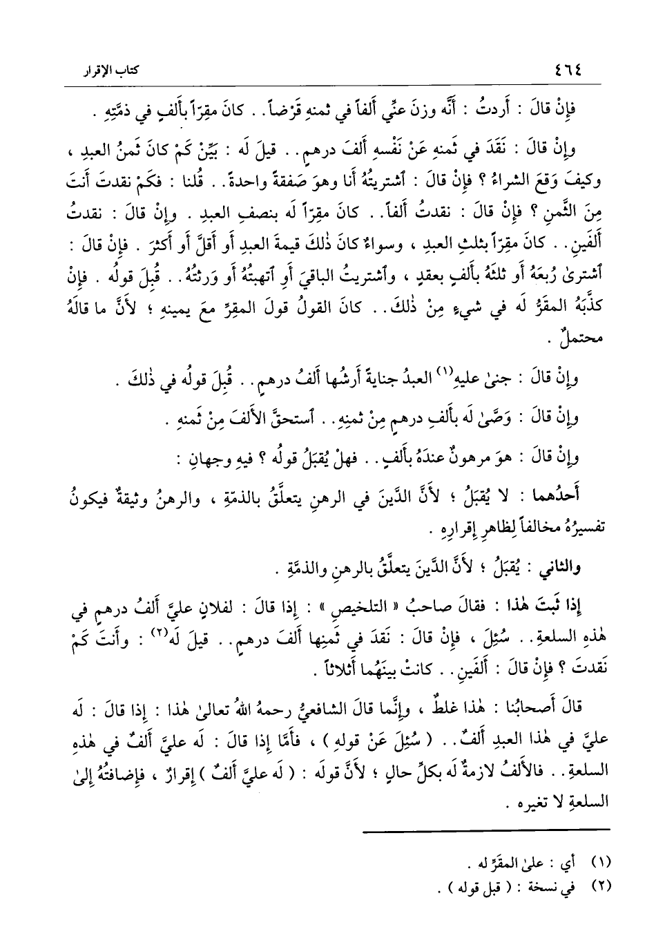 وإن قال: نقد في ثمنه عن نفسه ألف درهم.. قيل له: بين كم كان ثمن العبد، وكيف وقع الشراء؟ فإن قال: اشتريته أنا وهو صفقة واحدة.. قلنا: فكم نقدت أنت من الثمن؟ فإن قال: نقدت ألفا.. كان مقرا له بنصف العبد. وإن قال: نفدت ألفين.. كان مقرا بثلث العبد، وسواء كان ذلك قيمة العبد أو أقل أو أكثر. فإن قال: اشترى ربعه أو ثلثه بألف بعقد، واشتريت الباقي أو اتهبته أو ورثته.. قبل قوله. فإن كذبه المقر له في شيء من ذلك.. كان القول قول المقر مع يمينه؛ لأن ما قاله محتمل.