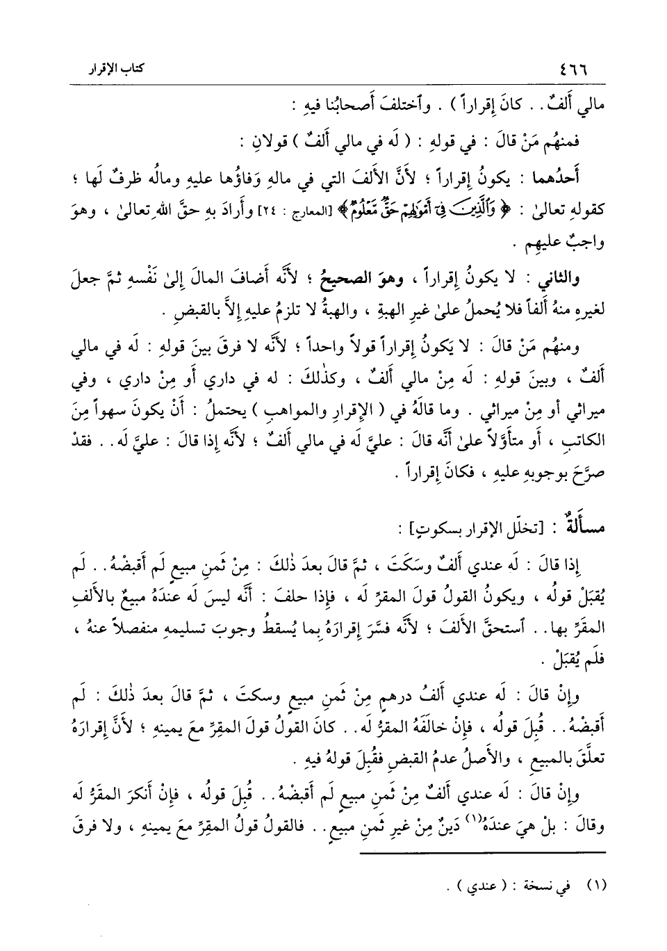 مالي ألف.. كان إقرارا) واختلف أصحابنا فيه: