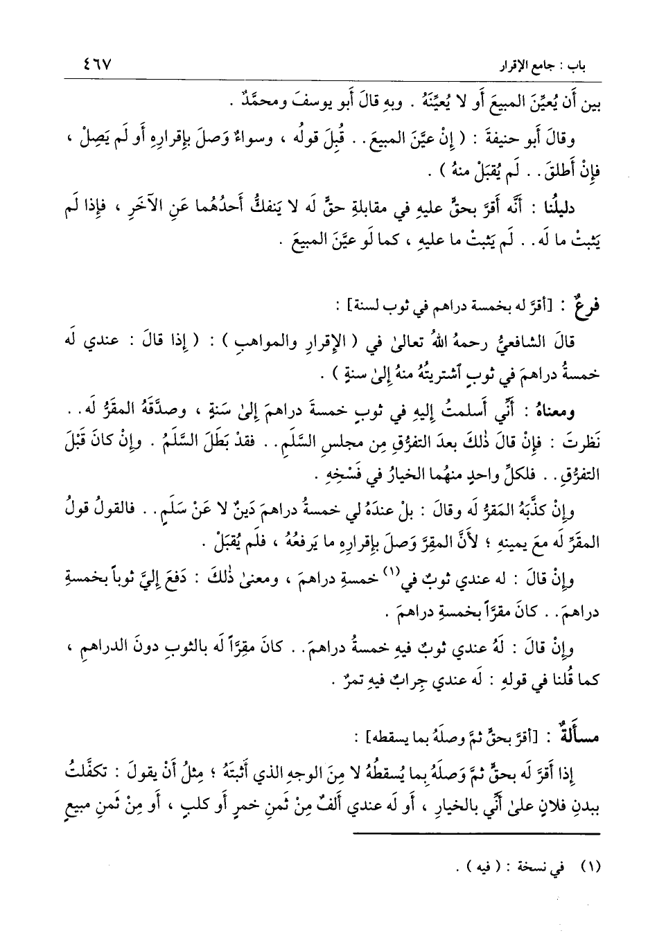 قال الشافعي - رَحِمَهُ اللَّهُ تَعَالَى - في (الإقرار والمواهب) : (إذا قال: عندي له خمسة دراهم في ثوب اشتريته منه إلى سنة) .