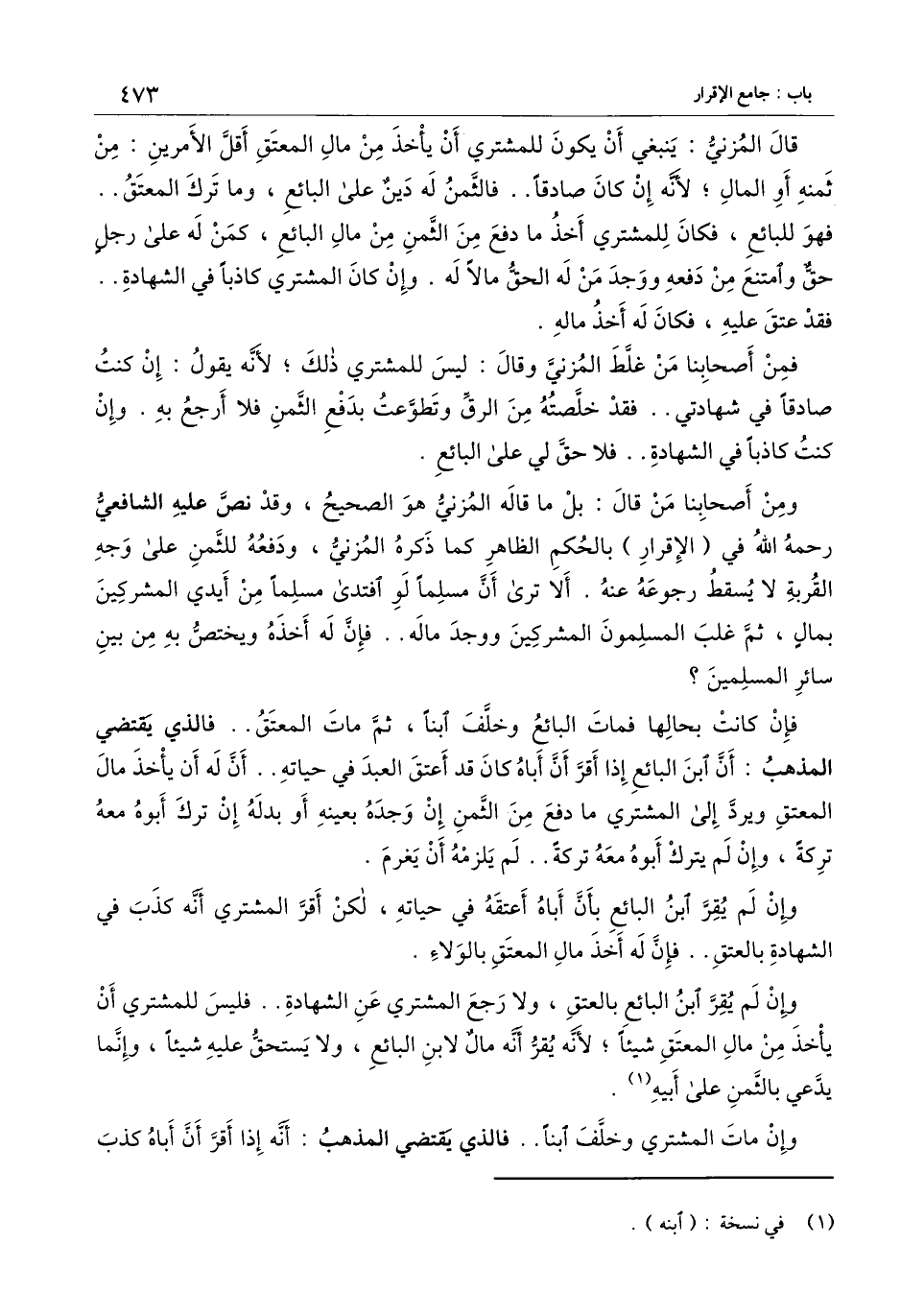 قال المزني: ينبغي أن يكون للمشتري أن يأخذ من مال المعتق أقل الأمرين: من ثمنه أو المال؛ لأنه إن كان صادقا.. فالثمن له دين على البائع، وما ترك المعتق.. فهو للبائع، فكان للمشتري أخذ ما دفع من الثمن من مال البائع، كمن له على رجل حق وامتنع من دفعه ووجد من له الحق مالا له. وإن كان المشتري كاذبا في الشهادة.. فقد عتق عليه، فكان له أخذ ماله.