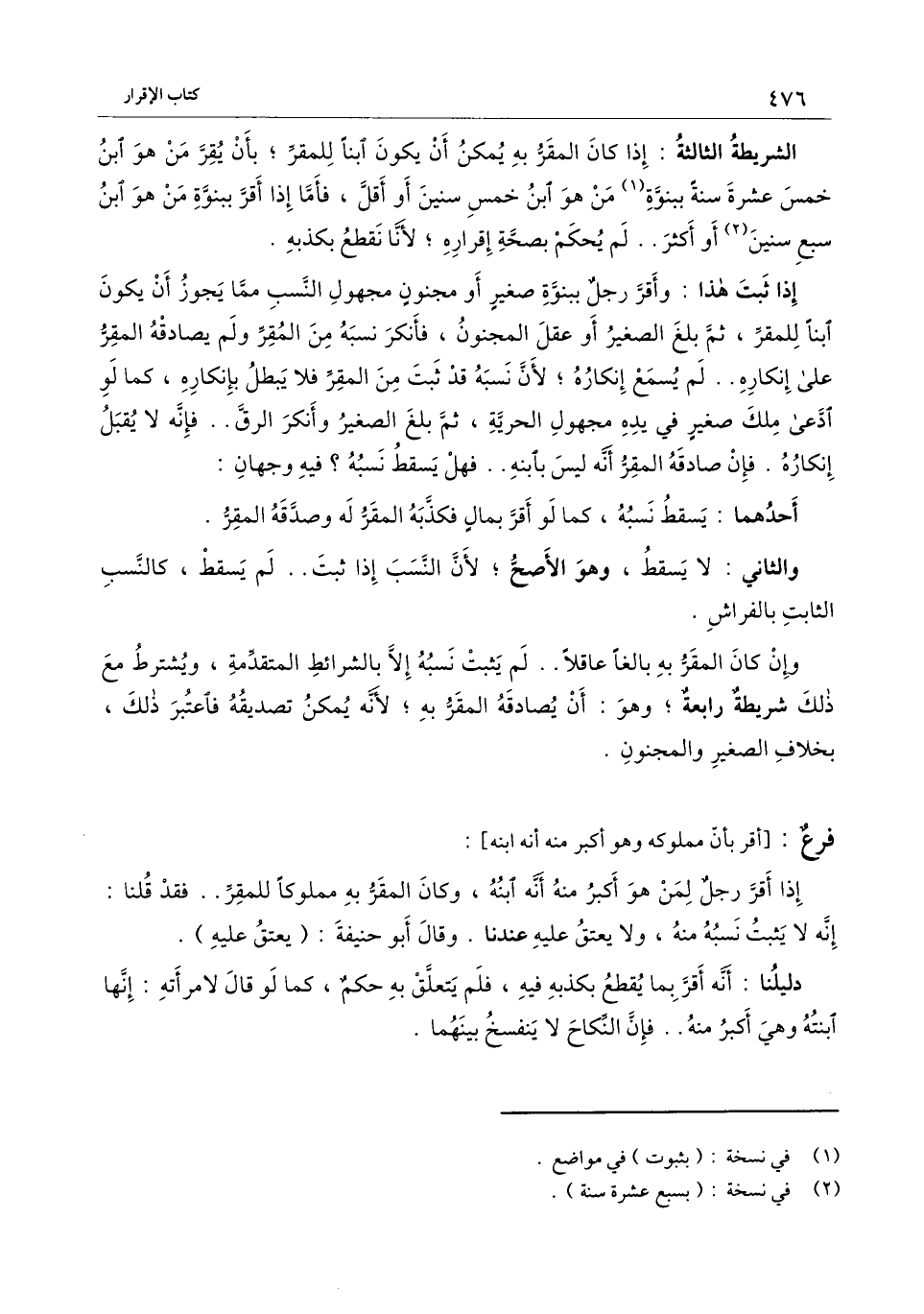الشريطة الثالثة: إذا كان المقر به يمكن أن يكون ابنا للمقر؛ بأن يقر من هو ابن خمس عشرة سنة ببنوة من هو ابن خمس سنين أو أقل، فأما إذا أقر ببنوة من هو ابن سبع سنين أو أكثر.. لم يحكم بصحة إقراره؛ لأنا نقطع بكذبه.
