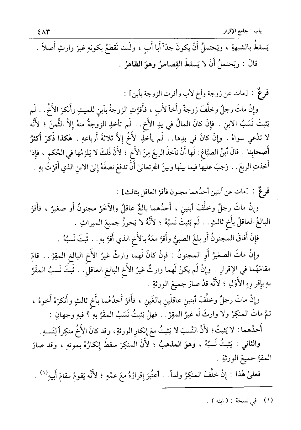 [فرع مات عن ابنين أحدهما مجنون فأقر العاقل بثالث]