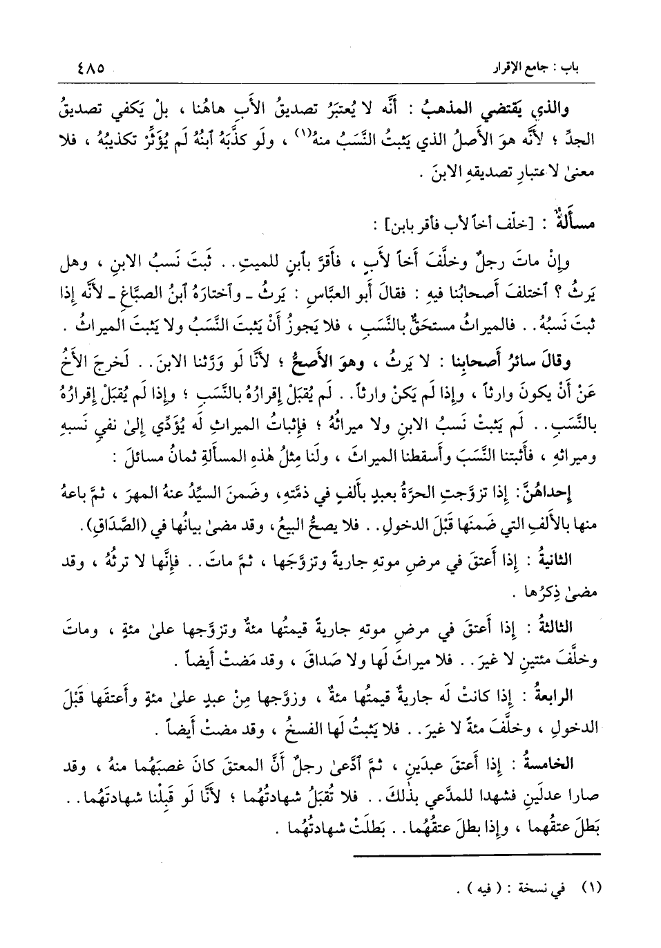 وقال سائر أصحابنا: لا يرث، وهو الأصح؛ لأنا لو ورثنا الابن.. لخرج الأخ عن أن يكون وارثا، وإذا لم يكن وارثا.. لم يقبل إقراره بالنسب؛ وإذا لم يقبل إقراره بالنسب.. لم يثبت نسب الابن ولا ميراثه؛ فإثبات الميراث له يؤدي إلى نفي نسبه وميراثه، فأثبتنا النسب وأسقطنا الميراث، ولنا مثل هذه المسألة ثمان مسائل: