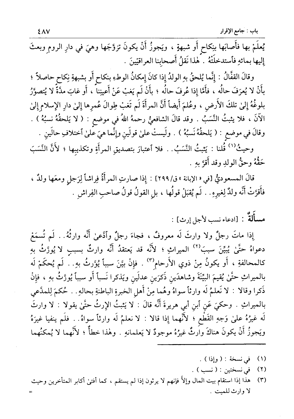 وقال القفال: إنما يلحق به الولد إذا كان إمكان الوطء بنكاح أو بشبهة نكاح حاصلا؛ بأن لا يعرف حاله، فأما إذا عرف حاله؛ بأن لم يغب عن أعيننا، أو غاب مدة لا يتصور بلوغه إلى تلك الأرض، وعلم أيضا أن المرأة لم تغب طوال عمرها إلى دار الإسلام إلى الآن، فلا يثبت النسب. وقال الشافعي - رَحِمَهُ اللَّهُ - في موضع: (لا يلحقه نسبه) .