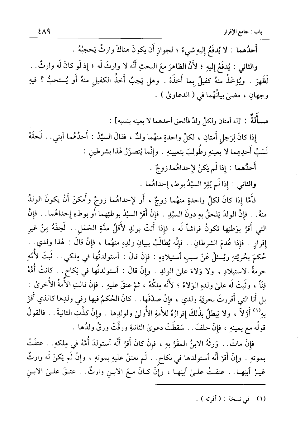 إذا كان لرجل أمتان، لكل واحدة منهما ولد، فقال السيد: أحدهما ابني.. لحقه نسب أحدهما لا بعينه وطولب بتعيينه. وإنما يتصور هذا بشرطين:
