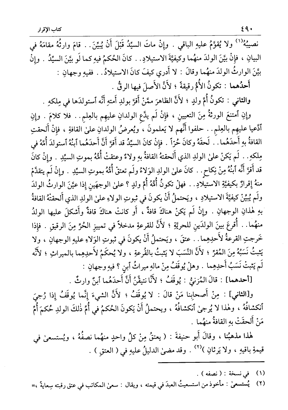 وإن امتنع الورثة من التعيين، فإن لم يدع الولدان عليهم بالعلم.. فلا كلام. وإن ادعيا عليهم بالعلم.. حلفوا أنهم لا يعلمون، ويعرض الولدان على القافة، فإن ألحقت القافة به أحدهما.. لحقه وكان حرا. فإن كان السيد قد أقر أن أحدهما ابنه استولد أمه في ملكه.. لم يكن على الولد الذي ألحقته القافة به ولاء وعتقت أمه بموت السيد. وإن كان قد أقر أنه ابنه من نكاح.. كان على الولد الولاء ولم تعتق أمه بموت السيد. وإن لم يتقدم منه إقرار بكيفية الاستيلاد.. فهل تكون أمه أم ولد؟ على الوجهين إذا عين الوارث الولد ولم يبين كيفية الاستيلاد، ويحتمل أن يكون في ثبوت الولاء على الولد الذي ألحقته القافة به هذان الوجهان. وإن لم يكن هناك قافة، أو كانت هناك قافة وأشكل عليها الولد منهما.. أقرع بين الولدين للحرية؛ لأن للقرعة مدخلا في تمييز الحر من الرقيق. فإذا خرجت القرعة لأحدهما.. عتق، ويحتمل أن يكون في ثبوت الولاء عليه الوجهان، ولا يثبت نسبه من المقر؛ لأن النسب لا يثبت بالقرعة، ولا يحكم لأحدهما بالميراث؛ لأنه لم يثبت نسب أحدهما. وهل يوقف من ماله ميراث ابن؟ فيه وجهان: