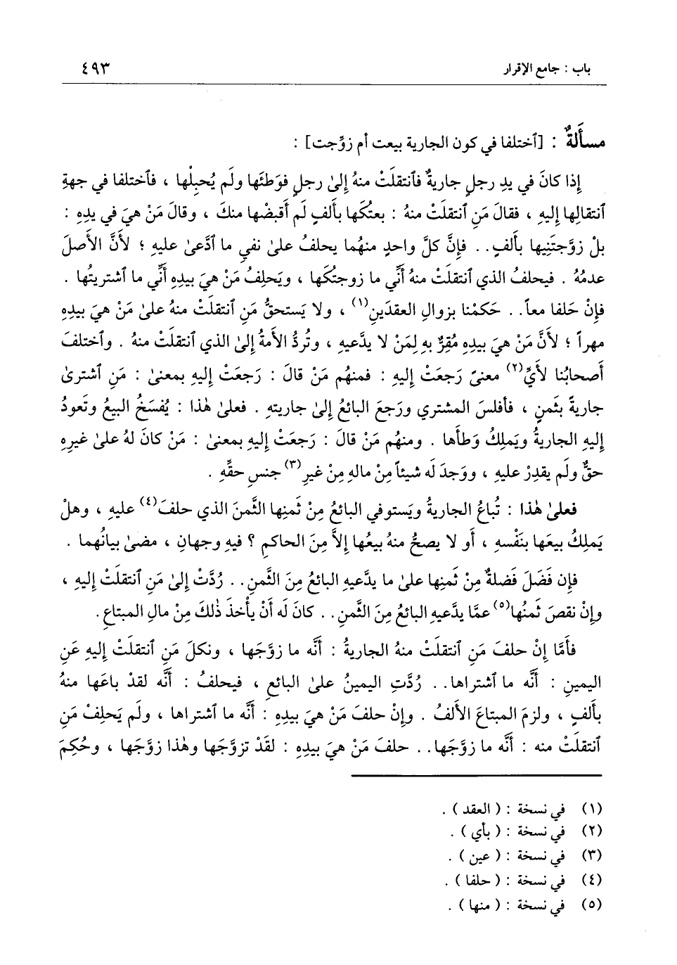 ] : إذا كان في يد رجل جارية فانتقلت منه إلى رجل فوطئها ولم يحبلها، فاختلفا في جهة انتقالها إليه، فقال من انتقلت منه: بعتكها بألف لم أقبضها منك، وقال من هي في يده: بل زوجتنيها بألف.. فإن كل واحد منهما يحلف على نفي ما ادعى عليه؛ لأن الأصل عدمه. فيحلف الذي انتقلت منه أني ما زوجتكها، ويحلف من هي بيده أني ما اشتريتها.