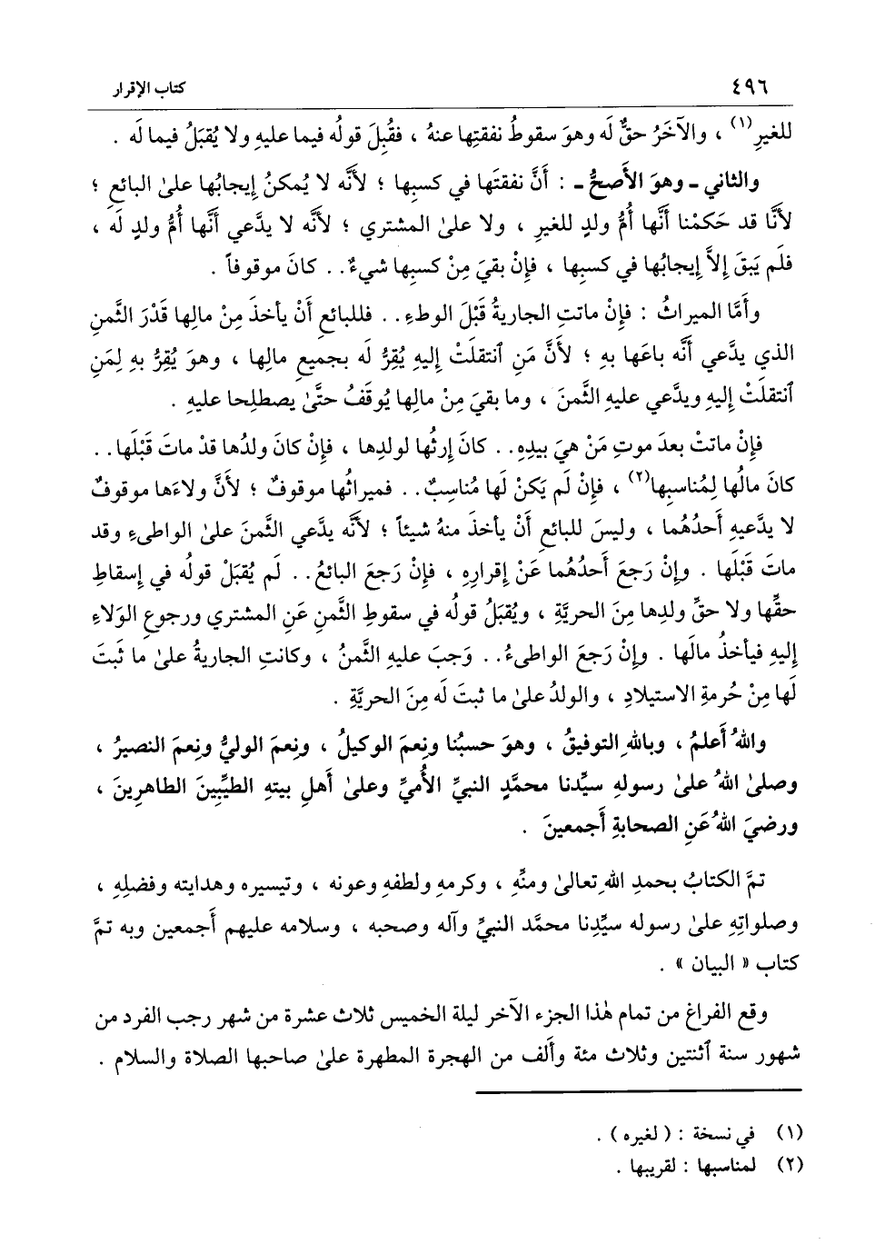 تم الكتاب بحمد الله تعالى منه، وكرمه ولطفه وعونه، وتيسيره وهدايته وفضله، وصلواته على رسوله سيدنا محمد النبي وآله وصحبه، وسلامه عليهم أجمعين وبه تم كتاب " البيان ".