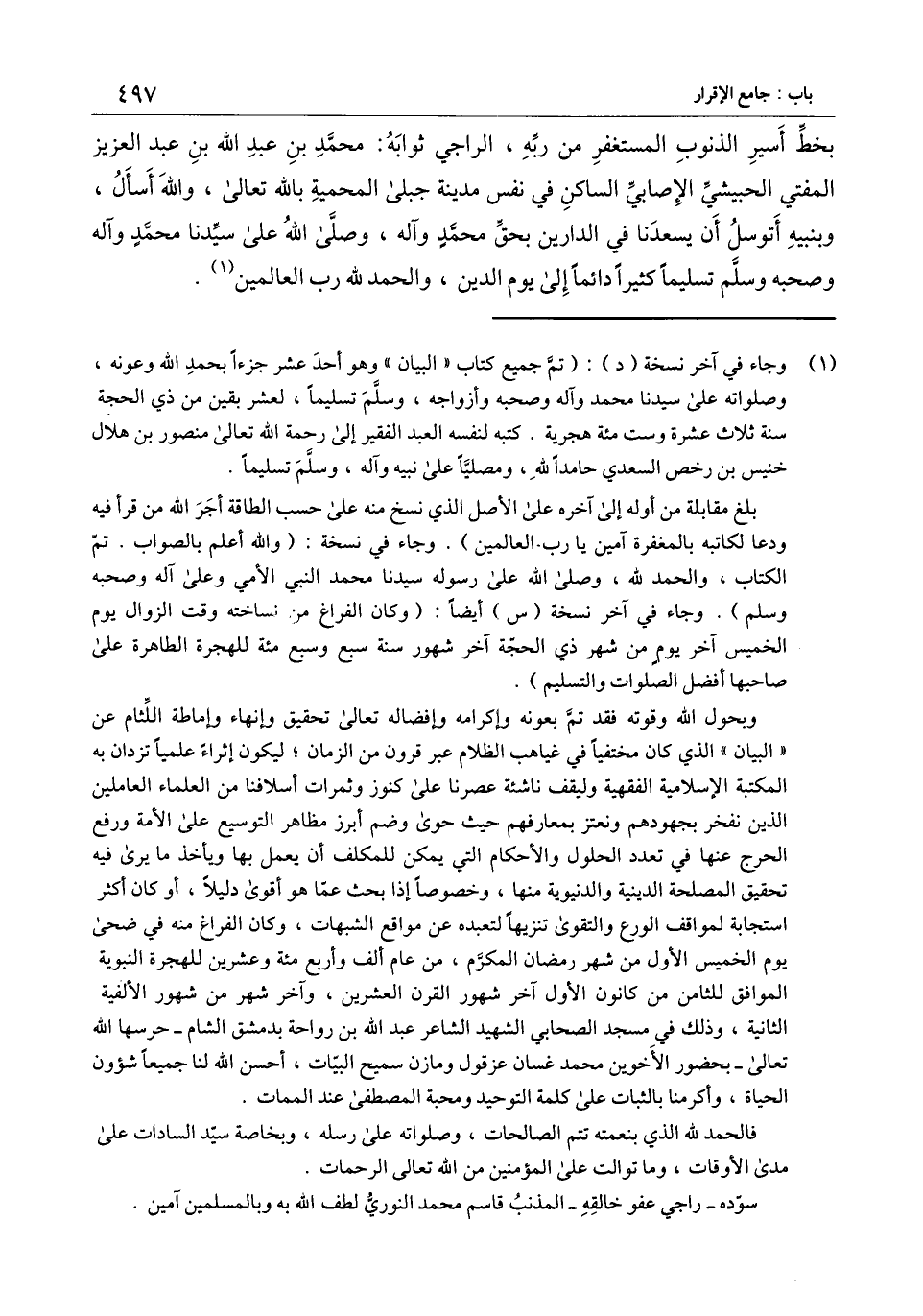 بخط أسير الذنوب المستغفر من ربه، الراجي ثوابه: محمد بن عبد الله بن عبد العزيز المفتي الحبيشي الإصابي الساكن في نفس مدينة جبلى المحمية بالله تعالى، والله أسأل، وبنبيه أتوسل أن يسعدنا في الدارين بحق محمد وآله، وصلى الله على سيدنا محمد وآله وصحبه وسلم تسليما كثيرا دائما إلى يوم الدين، والحمد لله رب العالمين.