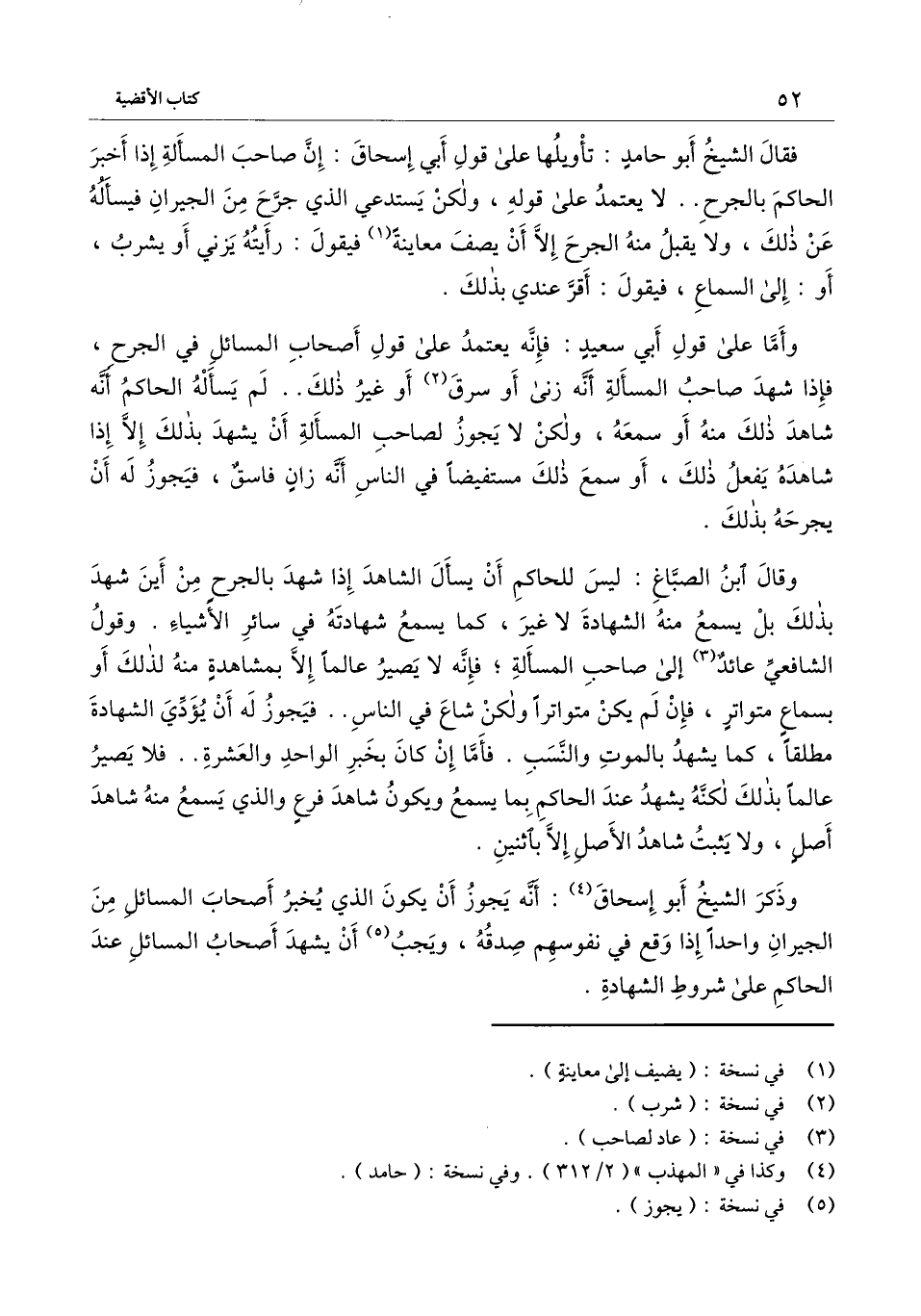 فقال الشيخ أبو حامد: تأويلها على قول أبي إسحاق: إن صاحب المسألة إذا أخبر الحاكم بالجرح.. لا يعتمد على قوله، ولكن يستدعى الذي جرح من الجيران فيسأله عن ذلك، ولا يقبل منه الجرح إلا أن يصف معاينة فيقول: رأيته يزني أو يشرب، أو: إلى السماع، فيقول: أقر عندي بذلك.