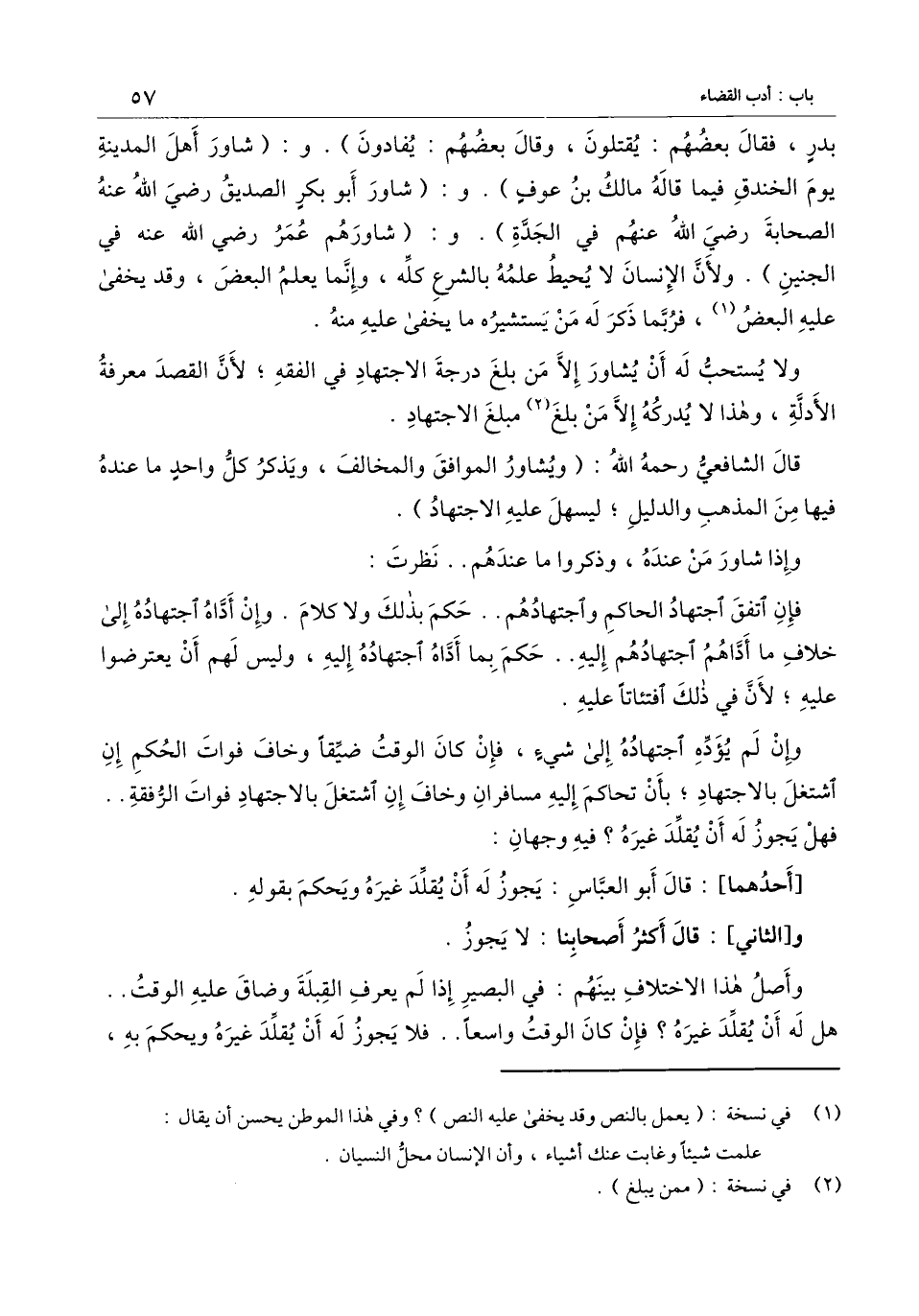قال الشافعي - رَحِمَهُ اللَّهُ -: (ويشاور الموافق والمخالف، ويذكر كل واحد ما عنده فيها من المذهب والدليل؛ ليسهل عليه الاجتهاد) .