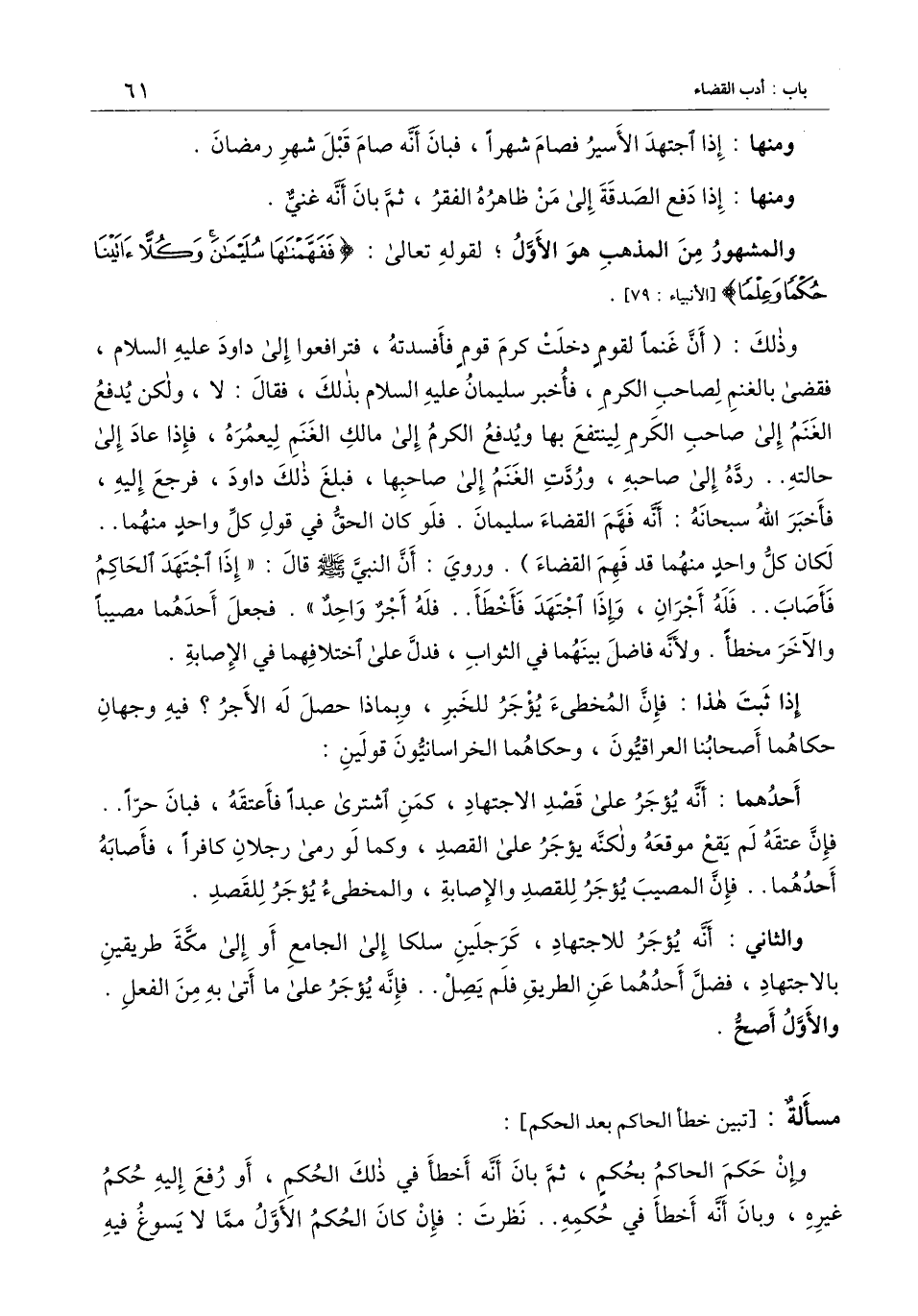 وذلك: (أن غنما لقوم دخلت كرم قوم فأفسدته، فترافعوا إلى داود - عَلَيْهِ السَّلَامُ -، فقضى بالغنم لصاحب الكرم، فأخبر سليمان - عَلَيْهِ السَّلَامُ - بذلك، فقال: لا، ولكن يدفع الغنم إلى صاحب الكرم لينتفع بها ويدفع الكرم إلى مالك الغنم ليعمره، فإذا عاد إلى حالته.. رده إلى صاحبه، وردت الغنم إلى صاحبها، فبلغ ذلك داود، فرجع إليه، فأخبر الله سبحانه: أنه فهم القضاء سليمان. فلو كان الحق في قول كل واحد منهما.. لكان كل واحد منهما قد فهم القضاء) . وروي: أن النبي - صَلَّى اللَّهُ عَلَيْهِ وَسَلَّمَ - قال: «إذا اجتهد الحاكم فأصاب.. فله أجران، وإذا اجتهد فأخطأ.. فله أجر واحد» . فجعل أحدهما مصيبا والآخر مخطئا. ولأنه فاضل بينهما في الثواب، فدل على اختلافهما في الإصابة.