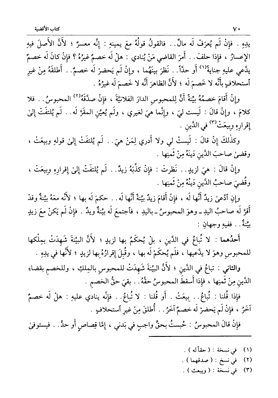 والثاني: تباع في الدين؛ لأن البينة شهدت للمحبوس بالملك، وللخصم بقضاء الدين من ثمنها، فإذا أسقط المحبوس حقه.. بقي حق الخصم.