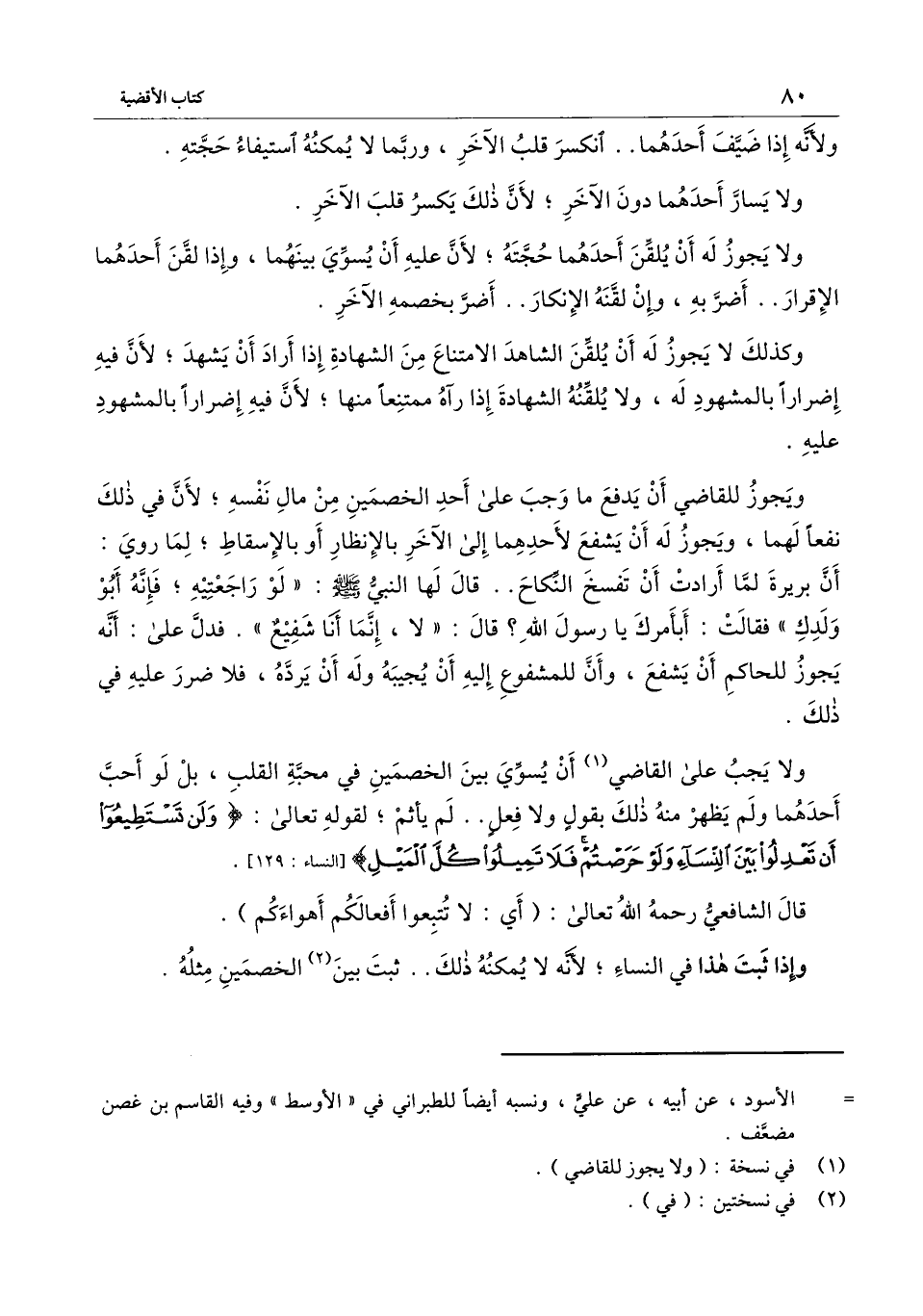ولا يجب على القاضي أن يسوي بين الخصمين في محبة القلب، بل لو أحب أحدهما ولم يظهر منه ذلك بقول ولا فعل.. لم يأثم؛ لِقَوْلِهِ تَعَالَى: {وَلَنْ تَسْتَطِيعُوا أَنْ تَعْدِلُوا بَيْنَ النِّسَاءِ وَلَوْ حَرَصْتُمْ فَلا تَمِيلُوا كُلَّ الْمَيْلِ} [النساء: 129] [النساء: 129] .