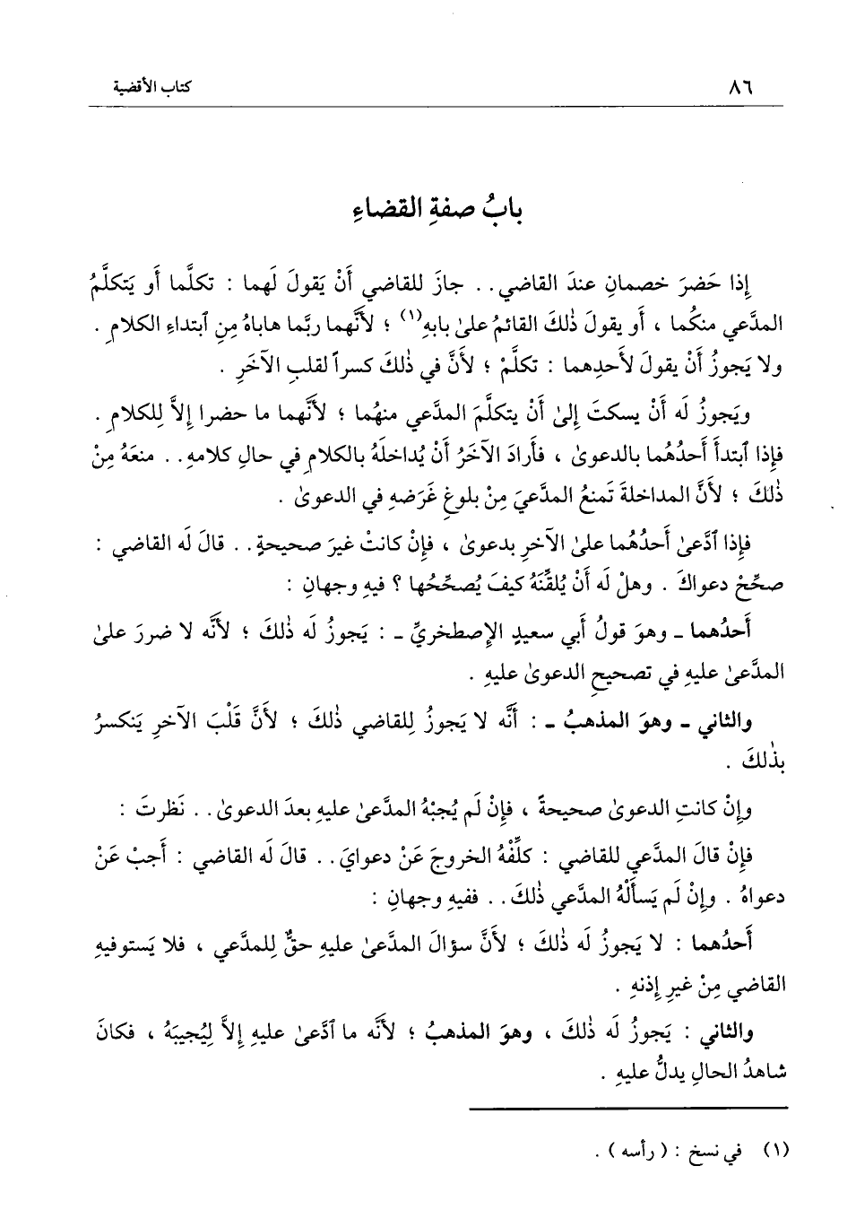 إذا حضر خصمان عند القاضي.. جاز للقاضي أن يقول لهما: تكلما أو يتكلم المدعي منكما، أو يقول ذلك القائم على بابه؛ لأنهما ربما هاباه من ابتداء الكلام. ولا يجوز أن يقول لأحدهما: تكلم؛ لأن في ذلك كسرا لقلب الآخر.