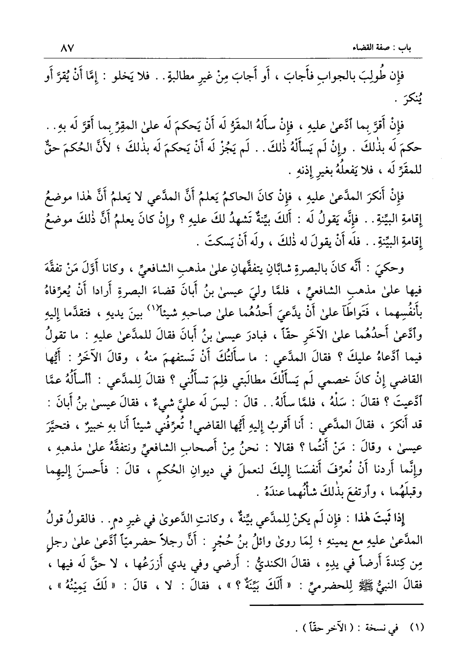 وحكي: أنه كان بالبصرة شابان يتفقهان على مذهب الشافعي، وكان أول من تفقه فيها على مذهب الشافعي، فلما ولي عيسى بن أبان قضاء البصرة أراد أن يعرفاه بأنفسهما، فتواطآ على أن يدعي أحدهما على صاحبه شيئا بين يديه، فتقدما إليه وادعى أحدهما على الآخر حقا، فبادر عيسى بن أبان فقال للمدعى عليه: ما تقول فيما ادعاه عليك؟ فقال المدعي: ما سألتك أن تستفهم منه، وقال الآخر: أيها القاضي إن كان خصمي لم يسألك مطالبتي فلم تسألني؟ فقال للمدعي: أأسأله عما ادعيت؟ فقال: سله، فلما سأله.. قال: ليس له علي شيء، فقال عيسى بن أبان: قد أنكر، فقال المدعي: أنا أقرب إليه أيها القاضي! تعرفني شيئا أنا به خبير، فتحير عيسى، وقال: من أنتما؟ فقالا: نحن من أصحاب الشافعي ونتفقه على مذهبه، وإنما أردنا أن نعرف أنفسنا إليك لنعمل في ديوان الحكم، قال: فأحسن إليهما وقبلهما، وارتفع بذلك شأنهما عنده.