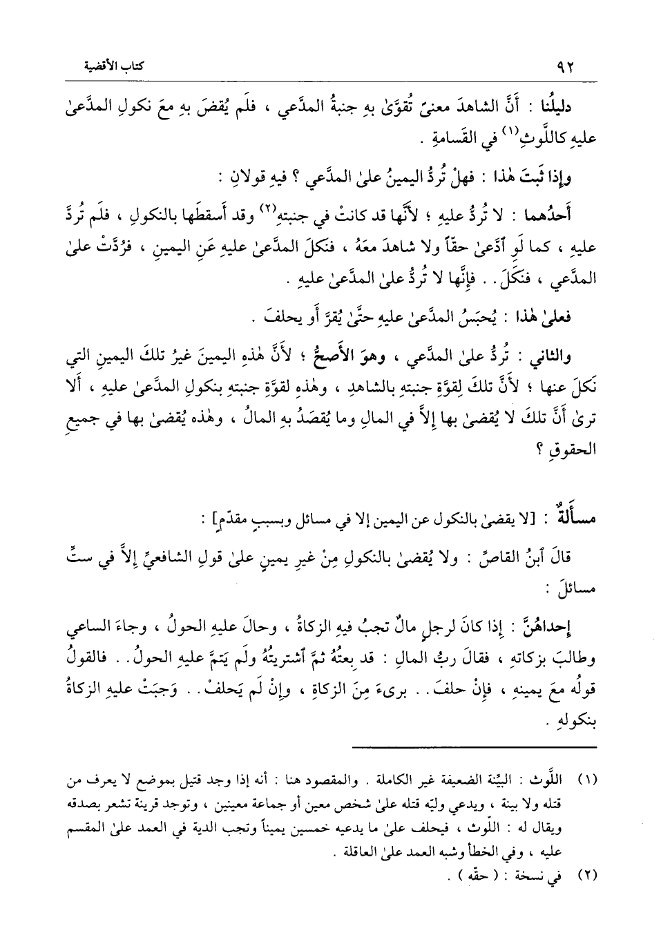 [مسألة لا يقضى بالنكول عن اليمين إلا في مسائل وبسبب مقدم]