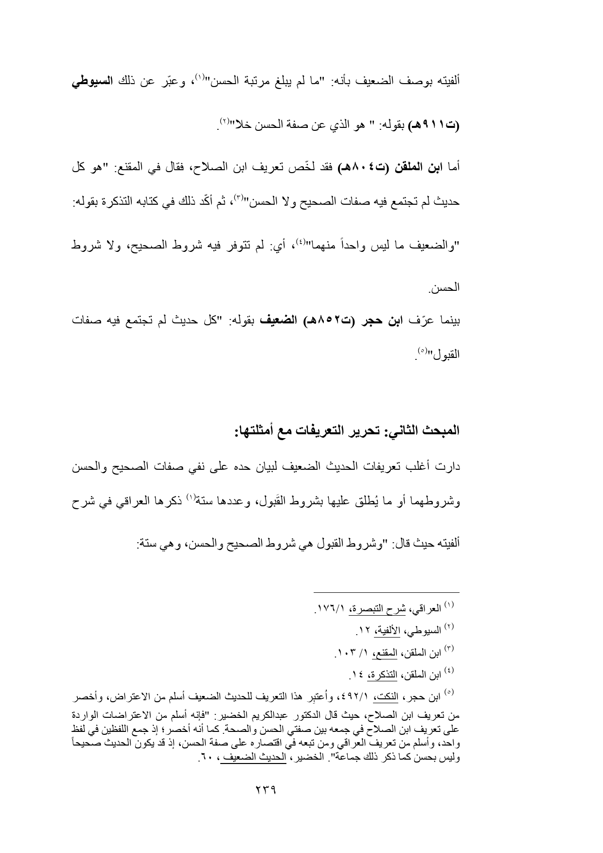 (¬5) ابن حجر، النكت، 1/ 492، واُعتبِر هذا التعريف للحديث الضعيف أسلم من الاعتراض، وأخصر من تعريف ابن الصلاح، حيث قال الدكتور عبدالكريم الخضير: "فإنه أسلم من الاعتراضات الواردة على تعريف ابن الصلاح في جمعه بين صفتي الحسن والصحة. كما أنه أخصر؛ إذ جمع اللفظين في لفظ واحد، وأسلم من تعريف العراقي ومن تبعه في اقتصاره على صفة الحسن، إذ قد يكون الحديث صحيحاً وليس بحسن كما ذكر ذلك جماعة". الخضير، الحديث الضعيف، 60.