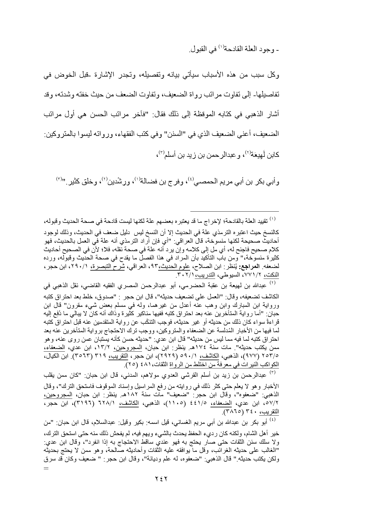 وكل سبب من هذه الأسباب سيأتي بيانه وتفصيله، وتجدر الإشارة -قبل الخوض في تفاصيلها- إلى تفاوت مراتب رواة الضعيف، وتفاوت الضعف من حيث خفته وشدته، وقد أشار الذهبي في كتابه الموقظة إلى ذلك فقال: "فآخر مراتب الحسن هي أول مراتب الضعيف، أعني الضعيف الذي في "السنن" وفي كتب الفقهاء، ورواته ليسوا بالمتروكين: كابن لَهِيعَة (¬2)، وعبدالرحمن بن زيد بن أسلم (¬3)،
