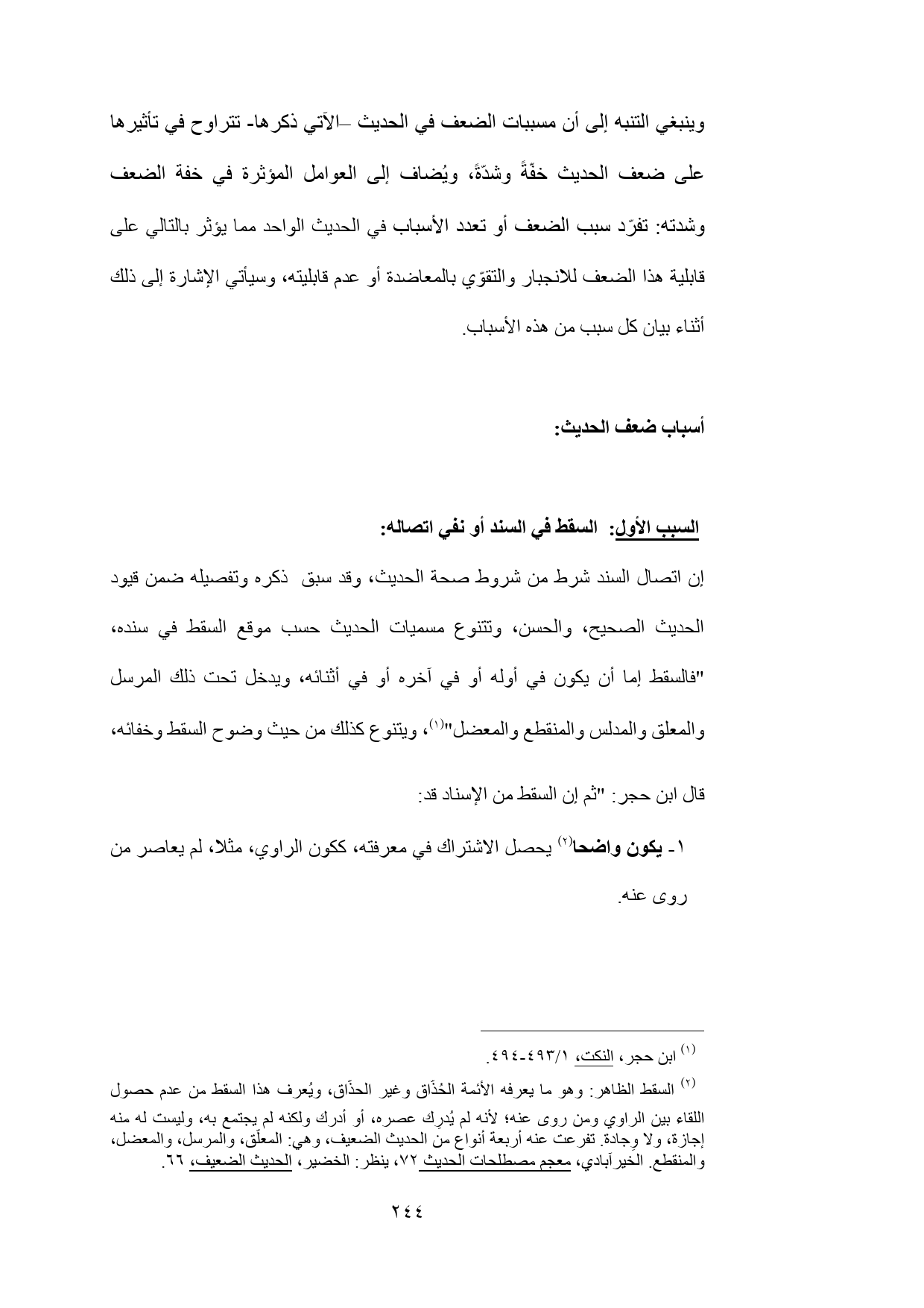 (¬2) السقط الظاهر: وهو ما يعرفه الأئمة الحُذّاق وغير الحذّاق، ويُعرف هذا السقط من عدم حصول اللقاء بين الراوي ومن روى عنه؛ لأنه لم يُدرِك عصره، أو أدرك ولكنه لم يجتمع به، وليست له منه إجازة، ولا وِجادة. تفرعت عنه أربعة أنواع من الحديث الضعيف، وهي: المعلّق، والمرسل، والمعضل، والمنقطع. الخيرآبادي، معجم مصطلحات الحديث 72، ينظر: الخضير، الحديث الضعيف، 66.