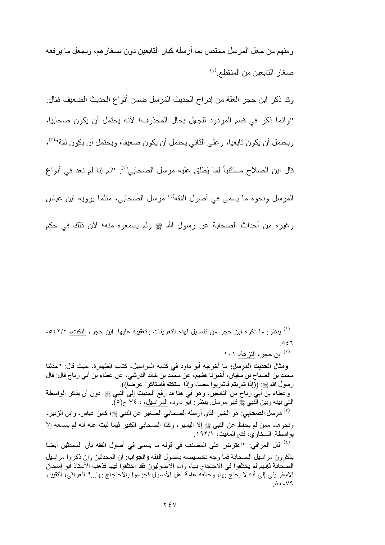 (¬4) قال العراقي: "اعترض على المصنف في قوله ما يسمى في أصول الفقه بأن المحدثين أيضا يذكرون مراسيل الصحابة فما وجه تخصيصه بأصول الفقه والجواب: أن المحدثين وإن ذكروا مراسيل الصحابة فإنهم لم يختلفوا في الاحتجاج بها، وأما الأصوليون فقد اختلفوا فيها فذهب الأستاذ أبو إسحاق الاسفرايني إلى أنه لا يحتج بها، وخالفه عامة أهل الأصول فجزموا بالاحتجاج بها ... " العراقي، التقييد، 79 - 80.