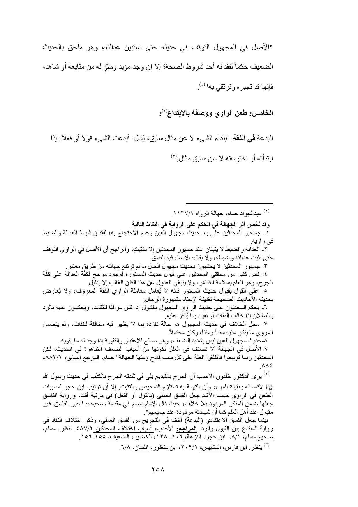 9 - الأصل في الجهالة ألا تصنف في العلل لكونها من أسباب الضعف الظاهرة في الحديث، لكن المحدثين ربما توسعوا فأطلقوا العلة على كل سبب قادح ومنها الجهالة" حمام، المرجع السابق، 2/ 883 - 884.