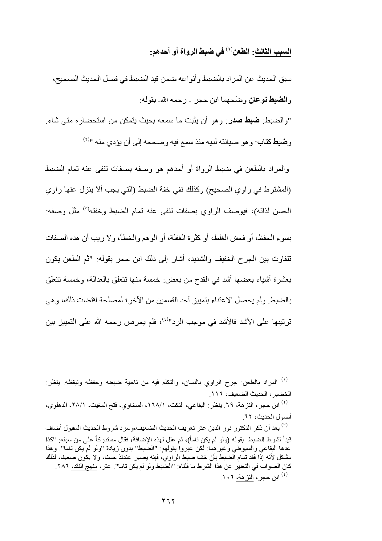 (¬3) بعد أن ذكر الدكتور نور الدين عتر تعريف الحديث الضعيف، وسرد شروط الحديث المقبول أضاف قيداً لشرط الضبط بقوله (ولو لم يكن تاماً)، ثم علل لهذه الإضافة، فقال مستدركاً على من سبقه: "كذا عدها البقاعي والسيوطي وغيرهما: لكن عبروا بقولهم: "الضبط" بدون زيادة "ولو لم يكن تاما". وهذا مشكل لأنه إذا فقد تمام الضبط بأن خف ضبط الراوي، فإنه يصير عندئذ حسنا، ولا يكون ضعيفا، لذلك كان الصواب في التعبير عن هذا الشرط ما قلناه: "الضبط ولو لم يكن تاما". عتر، منهج النقد، 286.