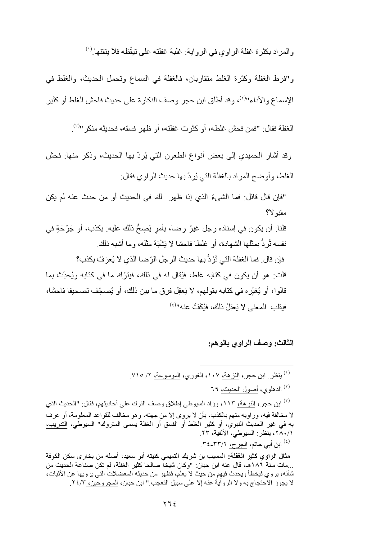 (¬3) ابن حجر، النزهة، 113، وزاد السيوطي إطلاق وصف الترك على أحاديثهم، فقال: "الحديث الذي لا مخالفة فيه، وراويه متهم بالكذب، بأن لا يروى إلا من جهته، وهو مخالف للقواعد المعلومة، أو عرف به في غير الحديث النبوي، أو كثير الغلط أو الفسق أو الغفلة يسمى المتروك" السيوطي، التدريب، 1/ 280، ينظر: السيوطي، الألفية، 23.