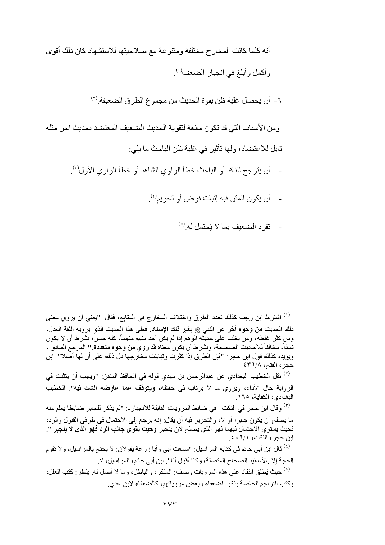 (¬1) اشترط ابن رجب كذلك تعدد الطرق واختلاف المخارج في المتابِع، فقال: "يعني أن يروي معنى ذلك الحديث من وجوه أخر عن النبي - صلى الله عليه وسلم - بغير ذلك الإسناد. فعلى هذا الحديث الذي يرويه الثقة العدل، ومن كثر غلطه، ومن يغلب على حديثه الوهم إذا لم يكن أحد منهم متهماً، كله حسن؛ بشرط أن لا يكون شاذاً، مخالفاً للأحاديث الصحيحة، وبشرط أن يكون معناه قد روي من وجوه متعددة." المرجع السابق.، ويؤيده كذلك قول ابن حجر: "فإن الطرق إذا كثرت وتباينت مخارجها دل ذلك على أن لها أصلا". ابن حجر، الفتح، 8/ 439.