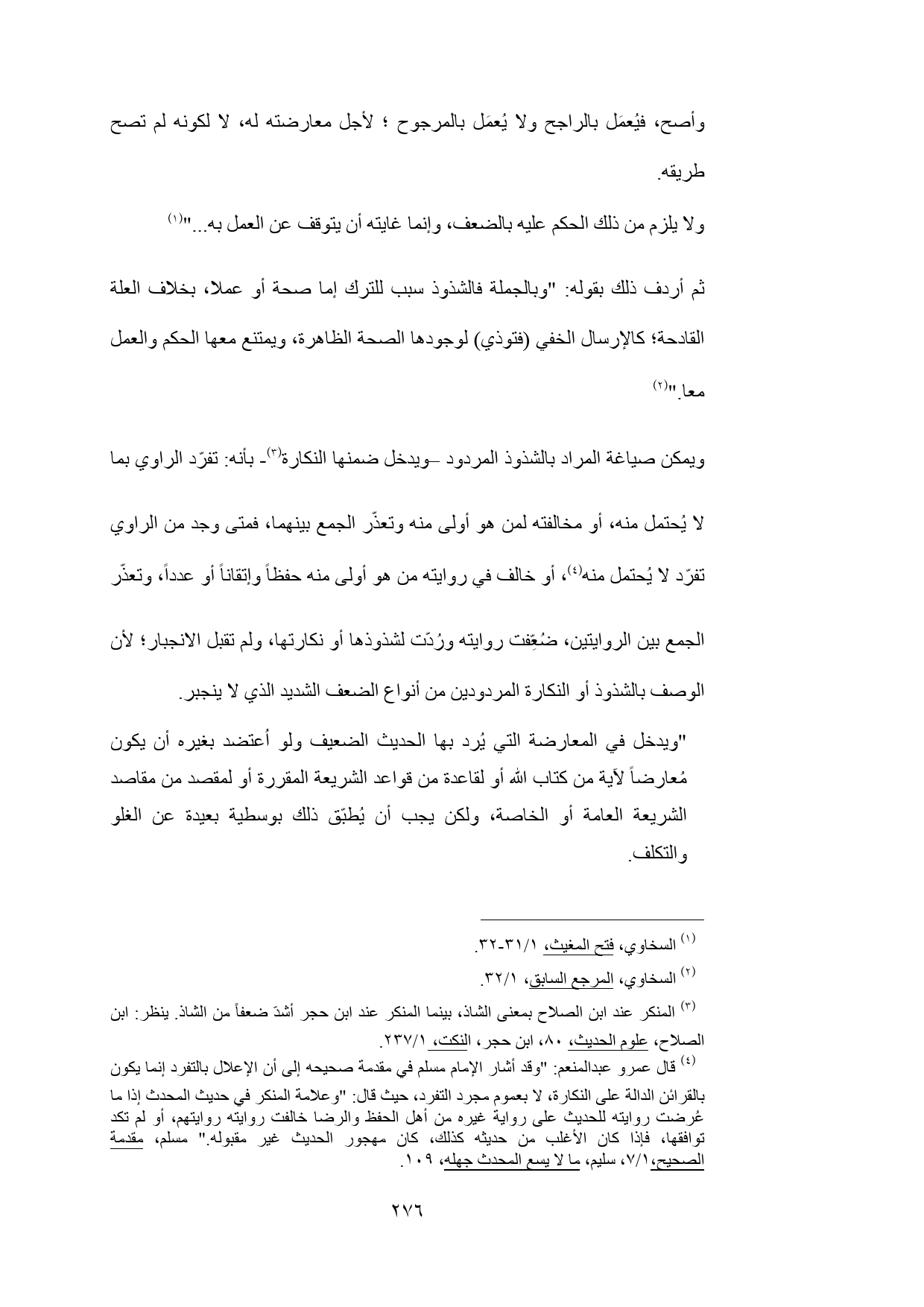(¬3) المنكر عند ابن الصلاح بمعنى الشاذ، بينما المنكر عند ابن حجر أشدّ ضعفاً من الشاذ. ينظر: ابن الصلاح، علوم الحديث، 80، ابن حجر، النكت، 1/ 237.
