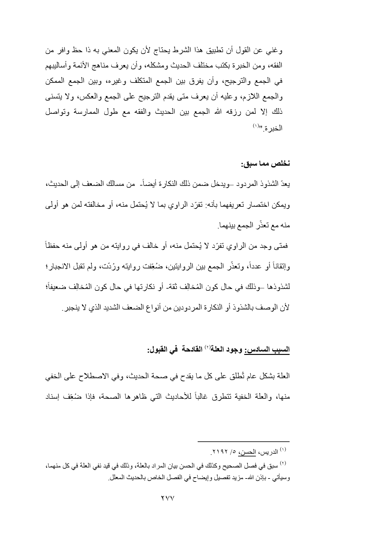 (¬2) سبق في فصل الصحيح وكذلك في الحسن بيان المراد بالعلة، وذلك في قيد نفي العلة في كل منهما، وسيأتي - بإذن الله- مزيد تفصيل وإيضاح في الفصل الخاص بالحديث المعلل.