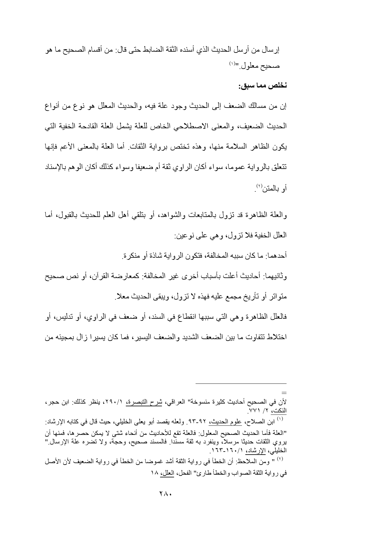(¬1) ابن الصلاح، علوم الحديث، 92 - 93. ولعله يقصد أبو يعلى الخليلي، حيث قال في كتابه الإرشاد: "العلة فأما الحديث الصحيح المعلول: فالعلة تقع للأحاديث من أنحاء شتى لا يمكن حصرها، فمنها أن يروي الثقات حديثا مرسلا, وينفرد به ثقة مسندا. فالمسند صحيح, وحجة, ولا تضره علة الإرسال." الخليلي، الإرشاد، 1/ 160 - 163.