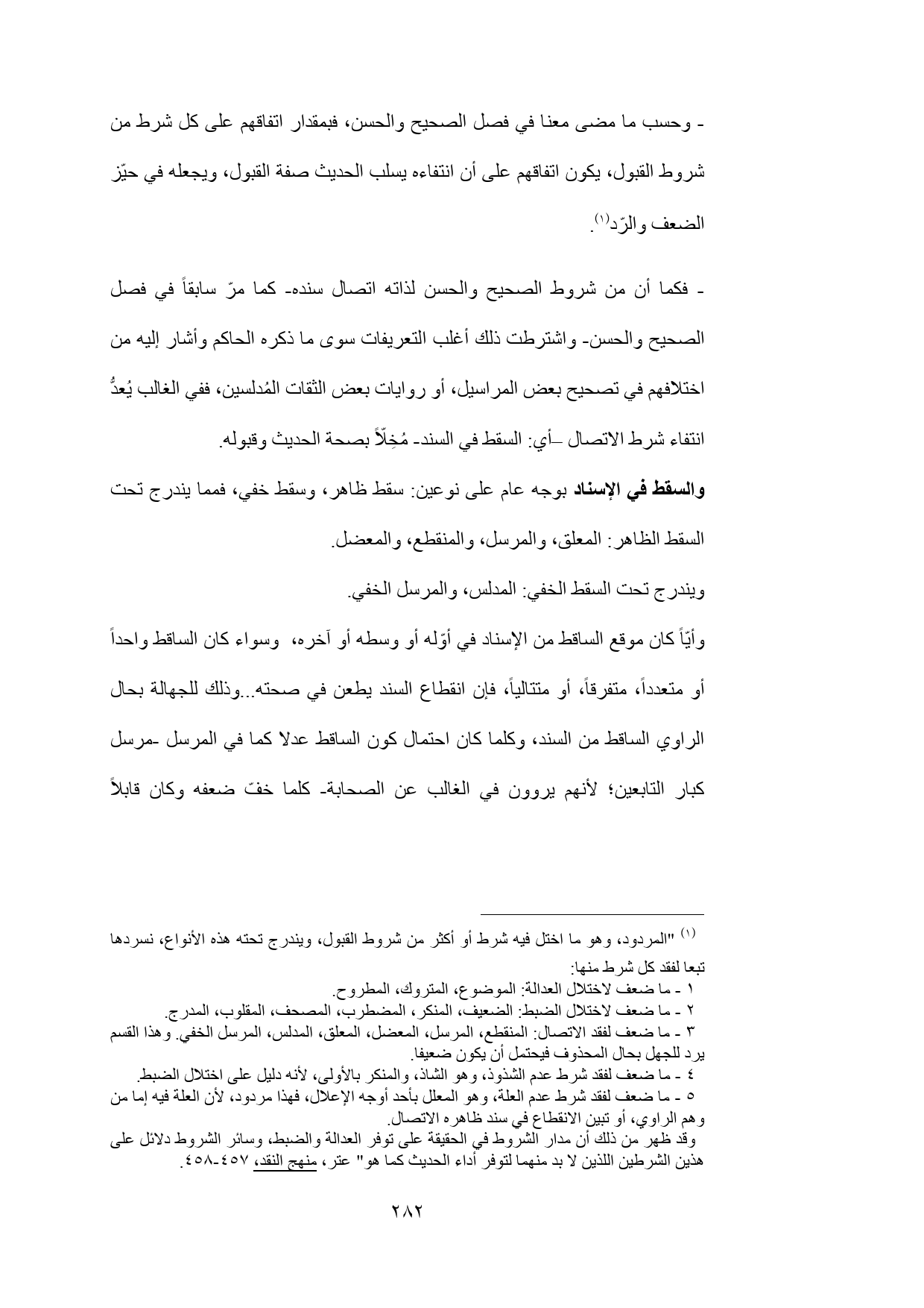 (¬1) "المردود، وهو ما اختل فيه شرط أو أكثر من شروط القبول، ويندرج تحته هذه الأنواع، نسردها تبعا لفقد كل شرط منها: