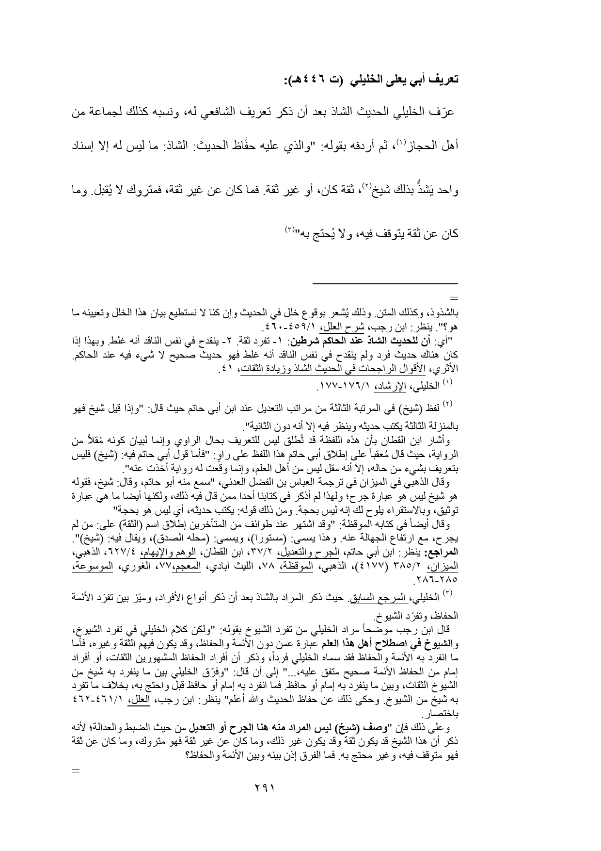 (¬3) الخليلي، المرجع السابق. حيث ذكر المراد بالشاذ بعد أن ذكر أنواع الأفراد، وميّز بين تفرّد الأئمة الحفاظ، وتفرّد الشيوخ.
