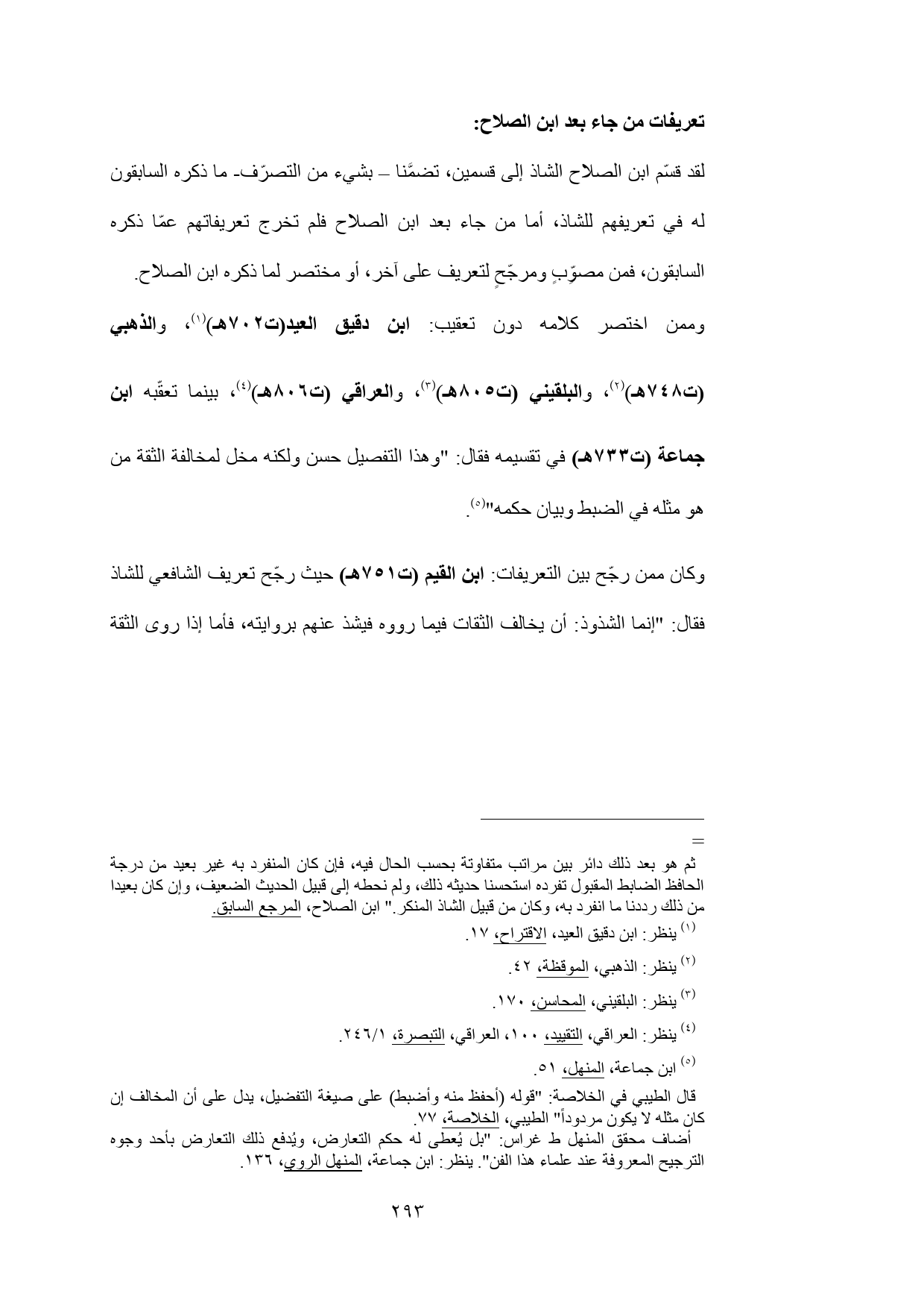 لقد قسّم ابن الصلاح الشاذ إلى قسمين، تضمَّنا - بشيء من التصرّف- ما ذكره السابقون له في تعريفهم للشاذ، أما من جاء بعد ابن الصلاح فلم تخرج تعريفاتهم عمّا ذكره السابقون، فمن مصوِّبٍ ومرجّحٍ لتعريف على آخر، أو مختصر لما ذكره ابن الصلاح.