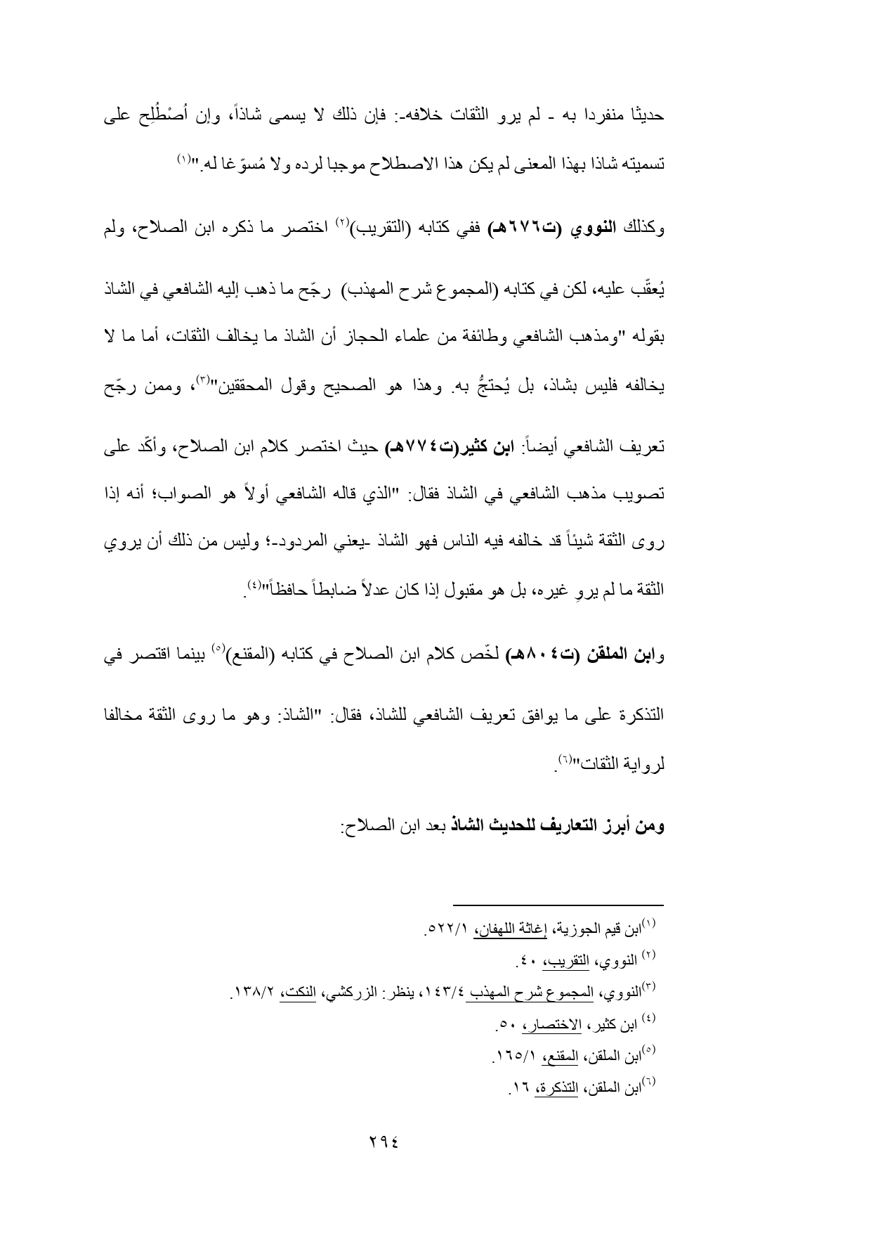 وكذلك النووي (ت 676 هـ) ففي كتابه (التقريب) (¬2) اختصر ما ذكره ابن الصلاح، ولم يُعقّب عليه، لكن في كتابه (المجموع شرح المهذب) رجّح ما ذهب إليه الشافعي في الشاذ بقوله "ومذهب الشافعي وطائفة من علماء الحجاز أن الشاذ ما يخالف الثقات، أما ما لا يخالفه فليس بشاذ، بل يُحتجُّ به. وهذا هو الصحيح وقول المحققين" (¬3)، وممن رجّح تعريف الشافعي أيضاً: ابن كثير (ت 774 هـ) حيث اختصر كلام ابن الصلاح، وأكّد على تصويب مذهب الشافعي في الشاذ فقال: "الذي قاله الشافعي أولاً هو الصواب؛ أنه إذا روى الثقة شيئاً قد خالفه فيه الناس فهو الشاذ -يعني المردود-؛ وليس من ذلك أن يروي الثقة ما لم يروِ غيره، بل هو مقبول إذا كان عدلاً ضابطاً حافظاً" (¬4).
