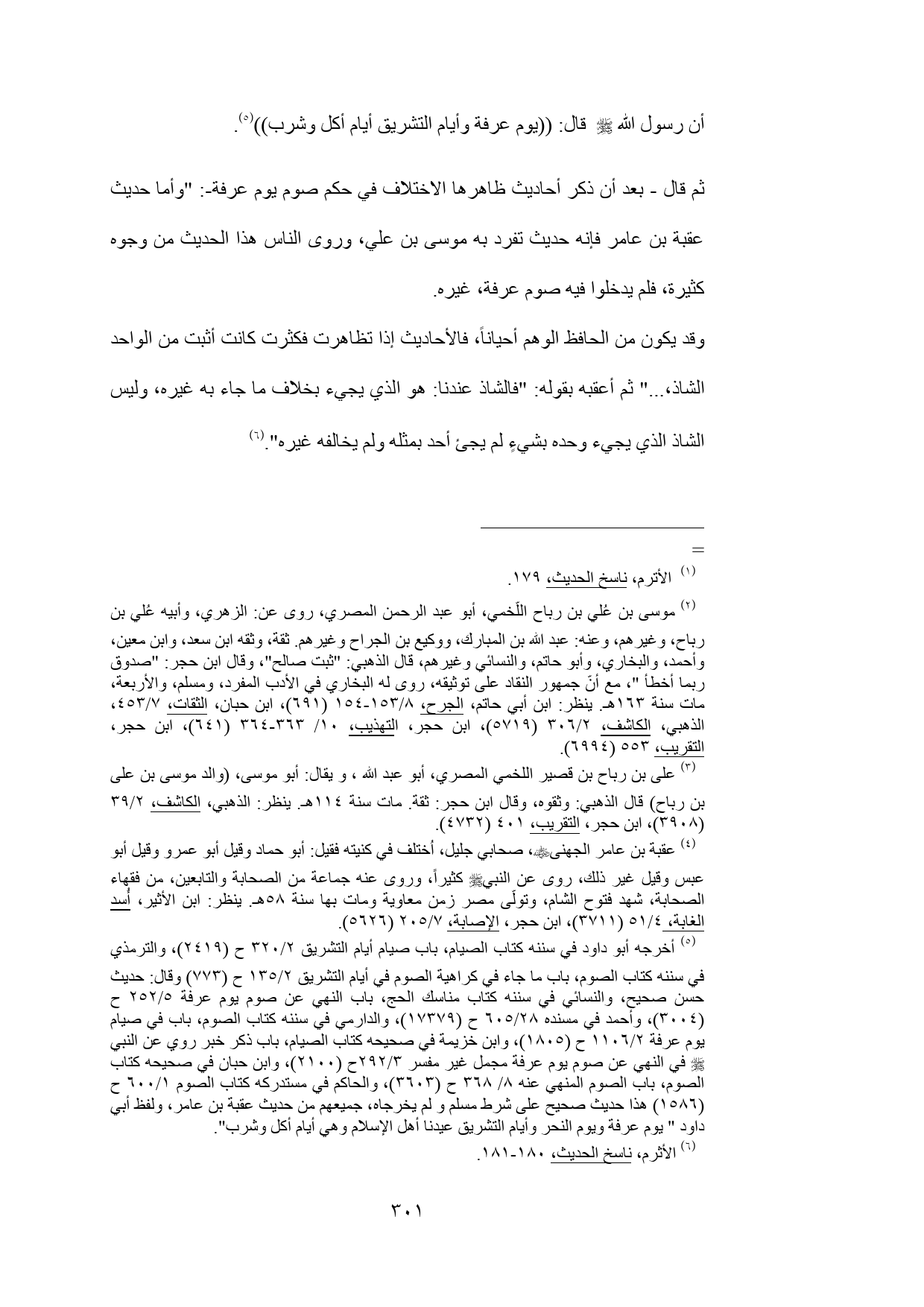 (¬1) أخرجه أبو داود في سننه كتاب الصيام، باب صيام أيام التشريق 2/ 320 ح (2419)، والترمذي في سننه كتاب الصوم، باب ما جاء في كراهية الصوم في أيام التشريق 2/ 135 ح (773) وقال: حديث حسن صحيح، والنسائي في سننه كتاب مناسك الحج، باب النهي عن صوم يوم عرفة 5/ 252 ح (3004)، وأحمد في مسنده 28/ 605 ح (17379)، والدارمي في سننه كتاب الصوم، باب في صيام يوم عرفة 2/ 1106 ح (1805)، وابن خزيمة في صحيحه كتاب الصيام، باب ذكر خبر روي عن النبي - صلى الله عليه وسلم - في النهي عن صوم يوم عرفة مجمل غير مفسر 3/ 292 ح (2100)، وابن حبان في صحيحه كتاب الصوم، باب الصوم المنهي عنه 8/ 368 ح (3603)، والحاكم في مستدركه كتاب الصوم 1/ 600 ح (1586) هذا حديث صحيح على شرط مسلم ولم يخرجاه، جميعهم من حديث عقبة بن عامر، ولفظ أبي داود " يوم عرفة ويوم النحر وأيام التشريق عيدنا أهل الإسلام وهي أيام أكل وشرب".