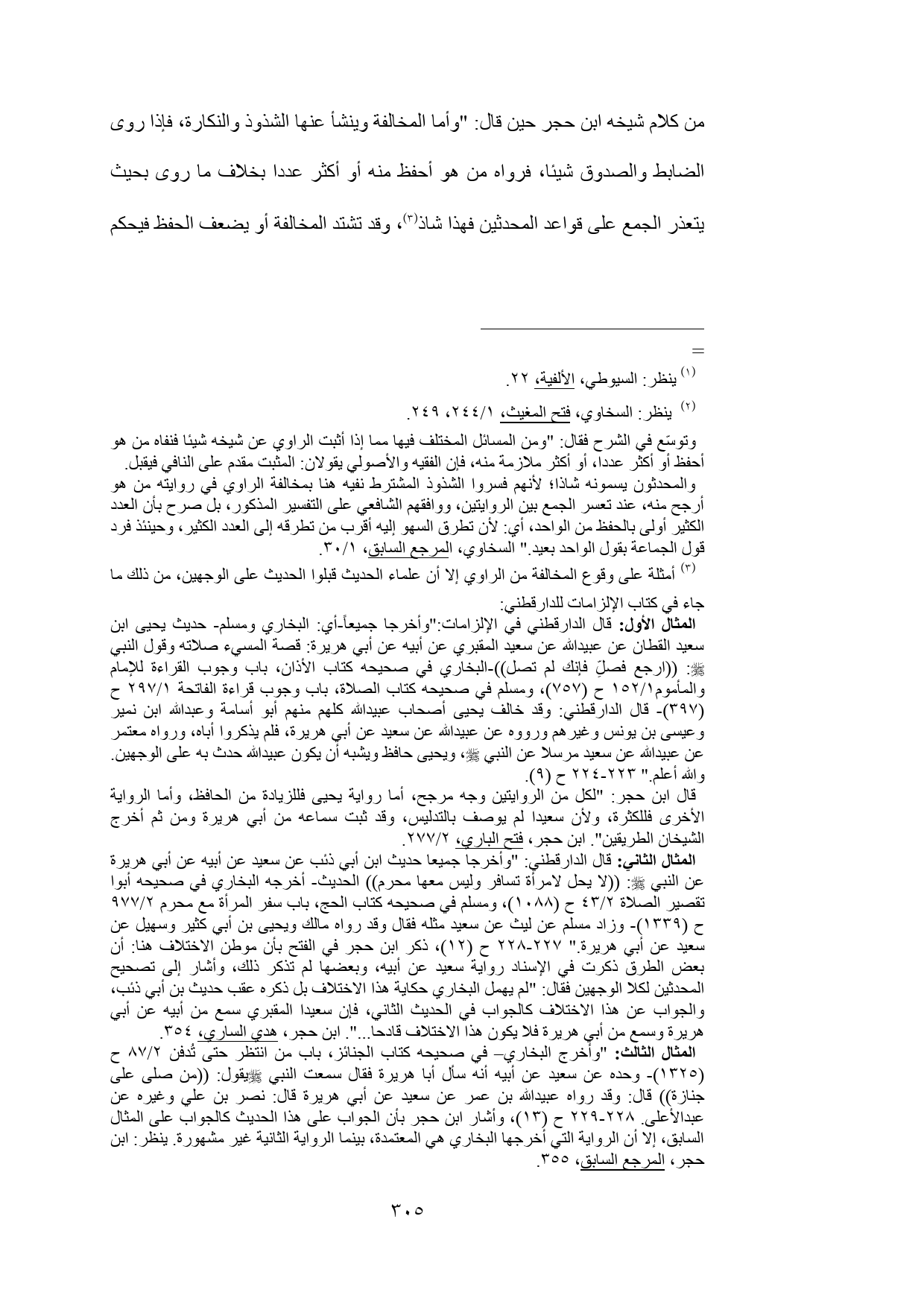 المثال الثاني: قال الدارقطني: "وأخرجا جميعا حديث ابن أبي ذئب عن سعيد عن أبيه عن أبي هريرة عن النبي - صلى الله عليه وسلم -: ((لا يحل لامرأة تسافر وليس معها محرم)) الحديث- أخرجه البخاري في صحيحه أبوا تقصير الصلاة 2/ 43 ح (1088)، ومسلم في صحيحه كتاب الحج، باب سفر المرأة مع محرم 2/ 977 ح (1339) - وزاد مسلم عن ليث عن سعيد مثله فقال وقد رواه مالك ويحيى بن أبي كثير وسهيل عن سعيد عن أبي هريرة." 227 - 228 ح (12)، ذكر ابن حجر في الفتح بأن موطن الاختلاف هنا: أن بعض الطرق ذكرت في الإسناد رواية سعيد عن أبيه، وبعضها لم تذكر ذلك، وأشار إلى تصحيح المحدثين لكلا الوجهين فقال: "لم يهمل البخاري حكاية هذا الاختلاف بل ذكره عقب حديث بن أبي ذئب، والجواب عن هذا الاختلاف كالجواب في الحديث الثاني، فإن سعيدا المقبري سمع من أبيه عن أبي هريرة وسمع من أبي هريرة فلا يكون هذا الاختلاف قادحا ... ". ابن حجر، هدي الساري، 354.