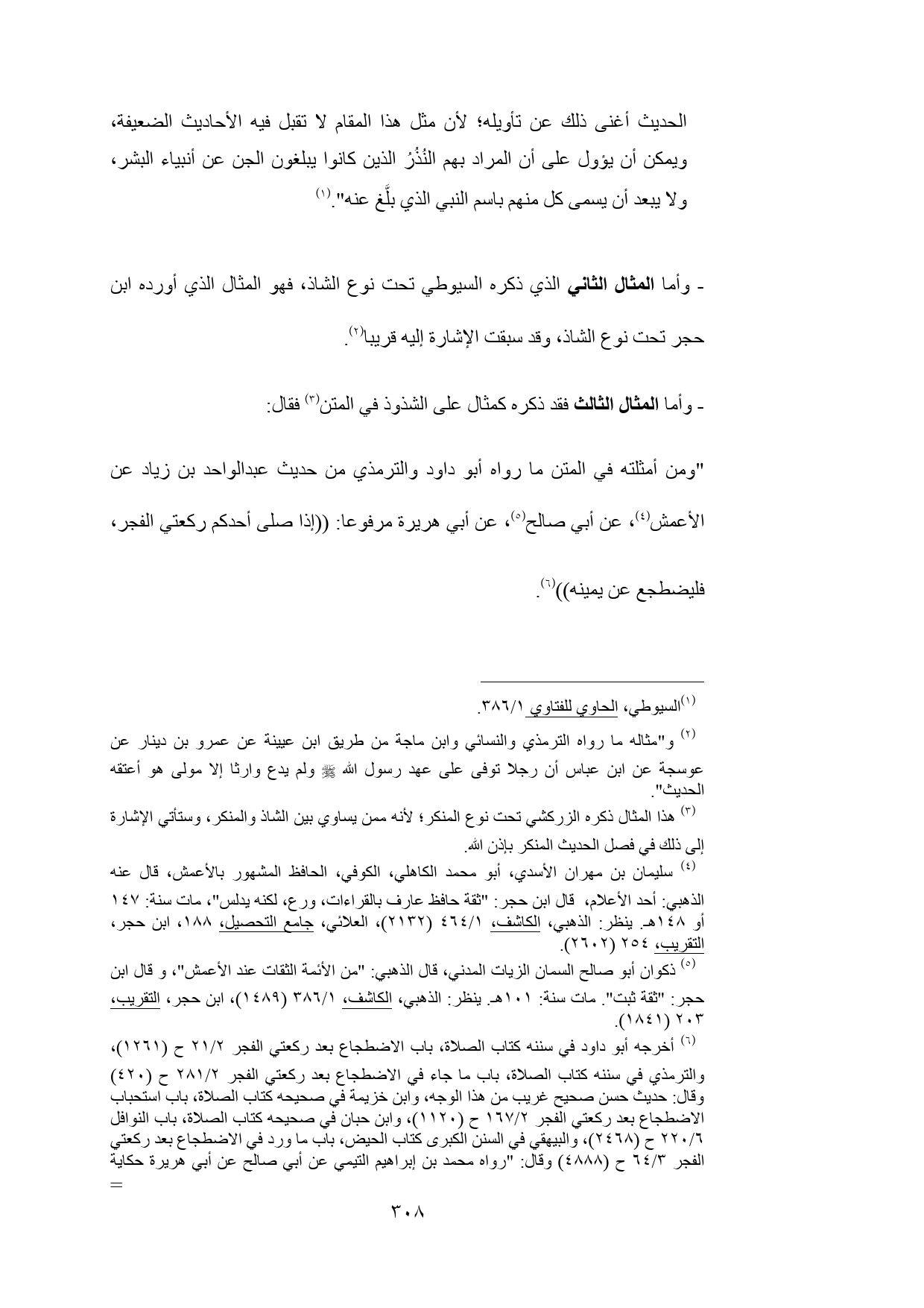 (¬3) هذا المثال ذكره الزركشي تحت نوع المنكر؛ لأنه ممن يساوي بين الشاذ والمنكر، وستأتي الإشارة إلى ذلك في فصل الحديث المنكر بإذن الله.