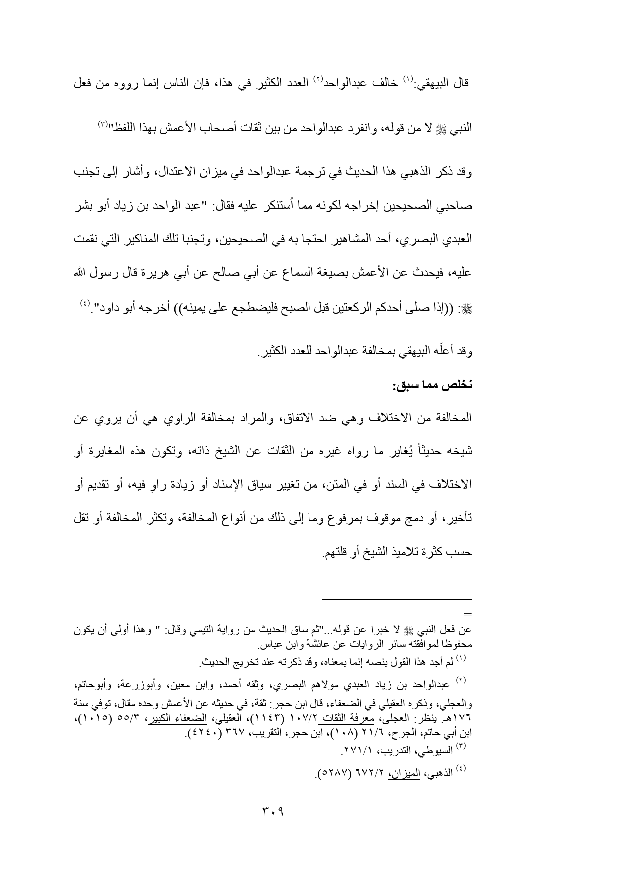 وقد أعلّه البيهقي بمخالفة عبدالواحد للعدد الكثير.