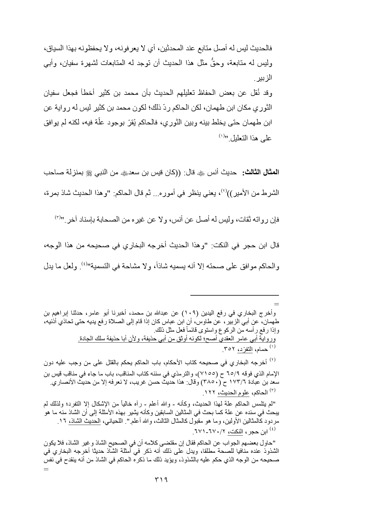 "لم يتلمس الحاكم علة لهذا الحديث، وكأنه - والله أعلم - رآه خالياً من الإشكال إلا التفرد؛ ولذلك لم يبحث في سنده عن علة كما بحث في المثالين السابقين وكأنه يشير بهذه الأمثلة إلى أن الشاذ منه ما هو مردود كالمثالين الأولين، وما هو مقبول كالمثال الثالث، والله أعلم.". اللحياني، الحديث الشاذ، 16.