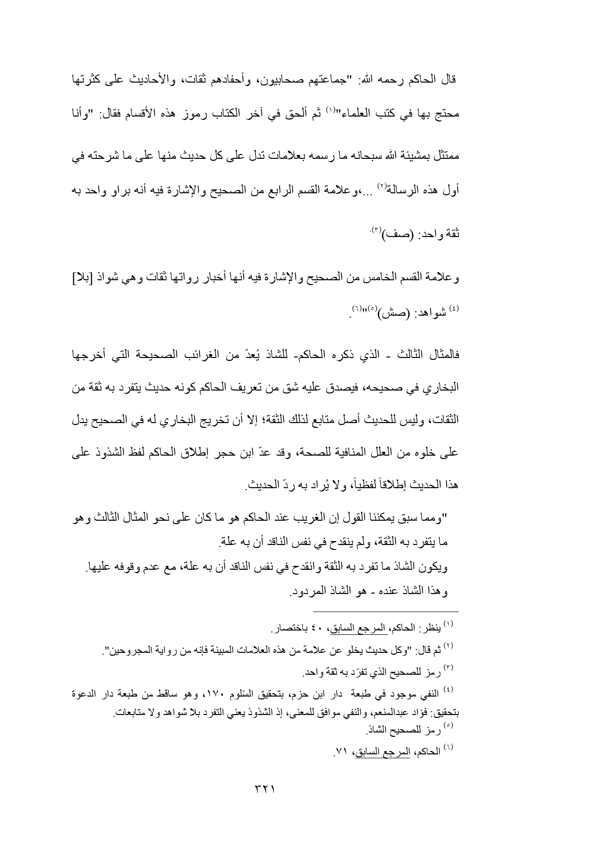 وعلامة القسم الخامس من الصحيح والإشارة فيه أنها أخبار رواتها ثقات وهي شواذ (بلا ((¬4) شواهد: (صش) (¬5) " (¬6).