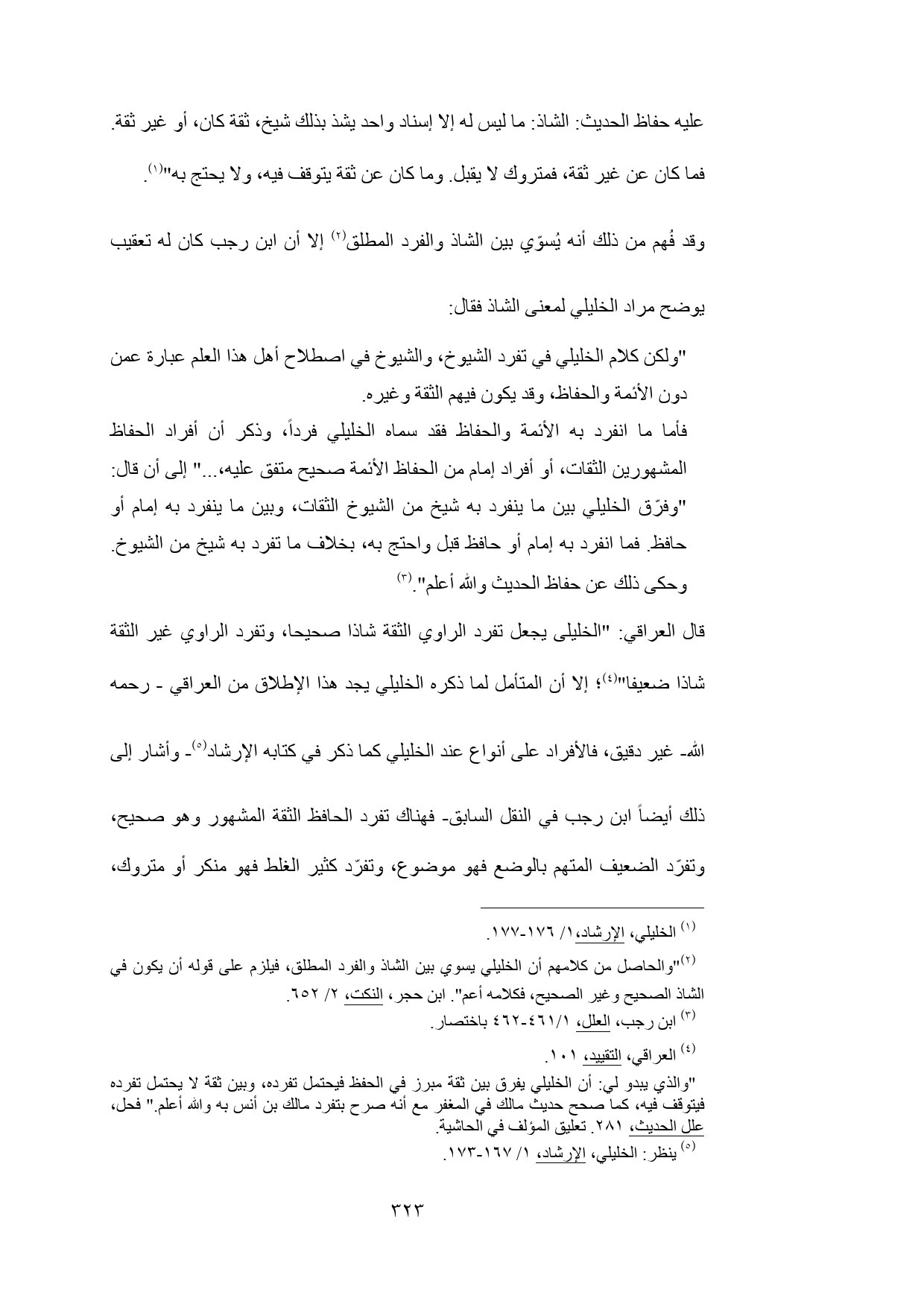 (¬2) "والحاصل من كلامهم أن الخليلي يسوي بين الشاذ والفرد المطلق، فيلزم على قوله أن يكون في الشاذ الصحيح وغير الصحيح، فكلامه أعم". ابن حجر، النكت، 2/ 652.