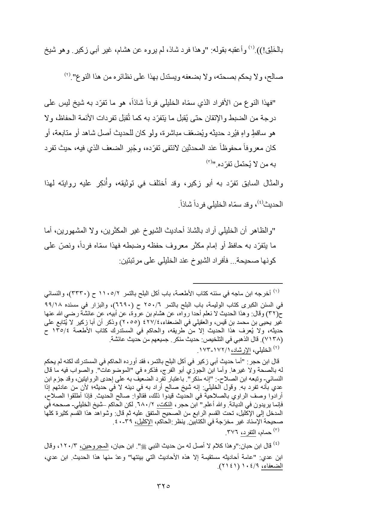 "فهذا النوع من الأفراد الذي سمّاه الخليلي فرداً شاذاً، هو ما تفرّد به شيخ ليس على درجة من الضبط والإتقان حتى يُقبل ما يَتفرّد به كما تُقبَل تفردات الأئمة الحفاظ، ولا هو ساقطٍ واهٍ فيُرد حديثه ويُضعّف مباشرة، ولو كان للحديث أصل شاهد أو متابعة، أو كان معروفاً محفوظاً عند المحدثين لانتفى تفرّده، وجُبِر الضعف الذي فيه، حيث تفرد به من لا يُحتمل تفرّده." (¬3)
