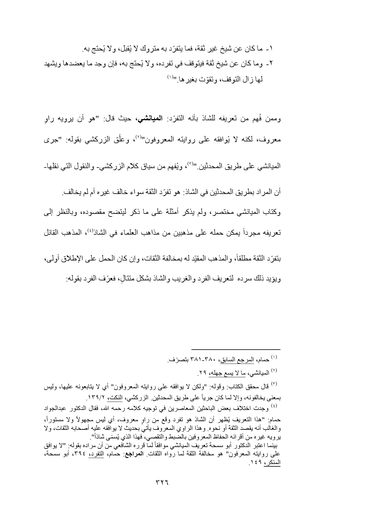 وممن فُهم من تعريفه للشاذ بأنه التفرّد: الميانشي، حيث قال: "هو أن يرويه راوٍ معروف، لكنه لا يُوافقه على روايته المعروفون" (¬2)، وعلّق الزركشي بقوله: "جرى الميانشي على طريق المحدثين." (¬3)، ويُفهم من سياق كلام الزركشي- والنقول التي نقلها- أن المراد بطريق المحدثين في الشاذ: هو تفرّد الثقة سواء خالف غيره أم لم يخالف.