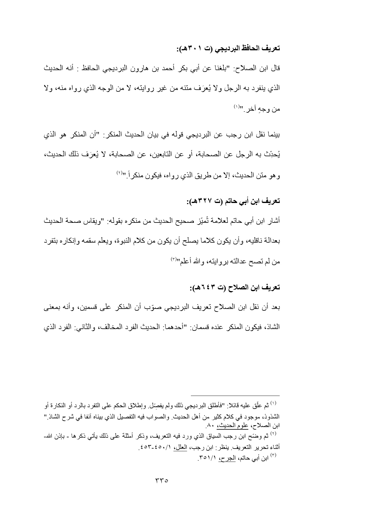 (¬1) ثم علّق عليه قائلا: "فأطلق البرديجي ذلك ولم يفصِّل. وإطلاق الحكم على التفرد بالرد أو النكارة أو الشذوذ، موجود في كلام كثير من أهل الحديث. والصواب فيه التفصيل الذي بيناه آنفا في شرح الشاذ." ابن الصلاح، علوم الحديث، 80.