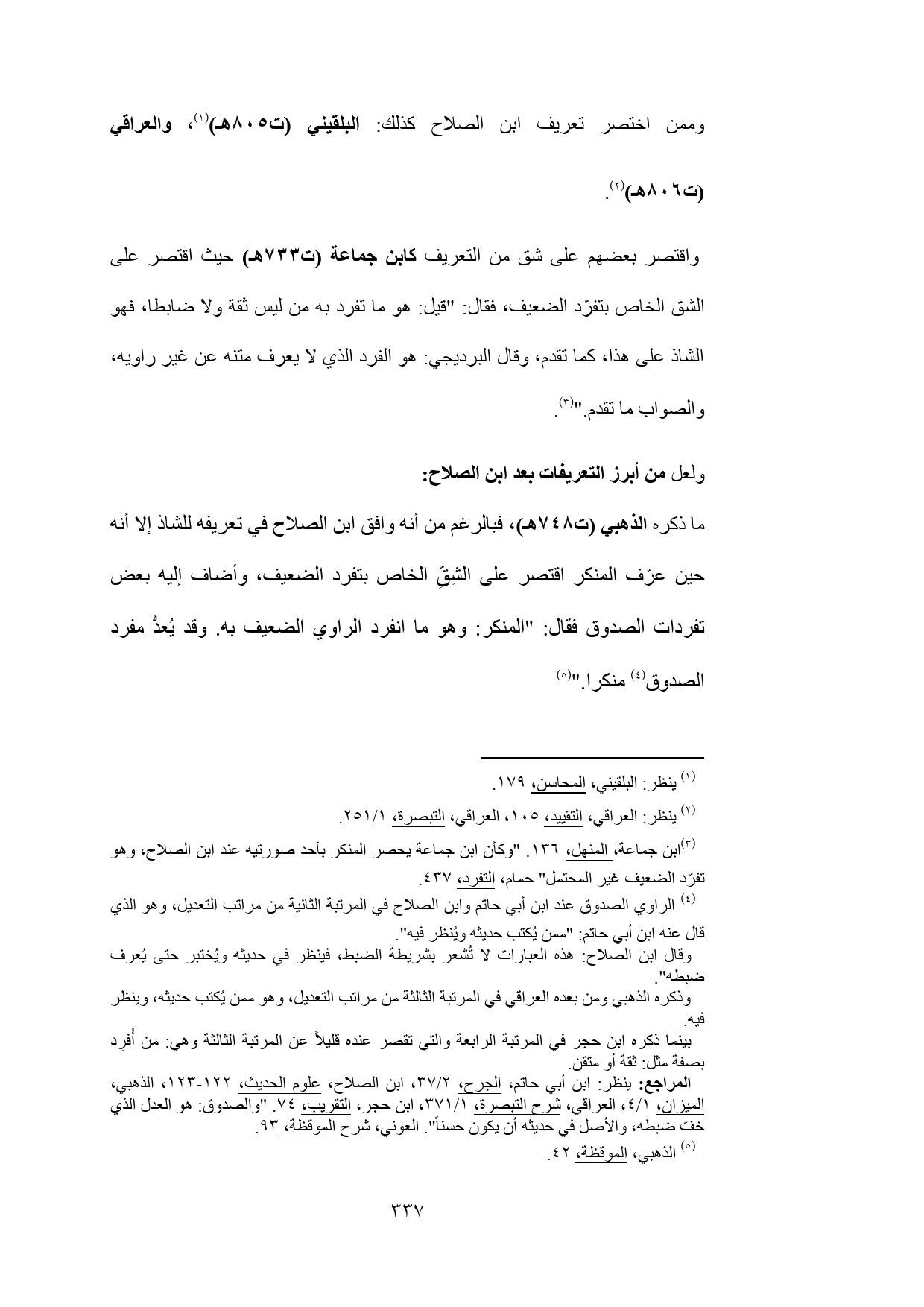 (¬3) ابن جماعة، المنهل، 136. "وكأن ابن جماعة يحصر المنكر بأحد صورتيه عند ابن الصلاح، وهو تفرّد الضعيف غير المحتمل" حمام، التفرد، 437.