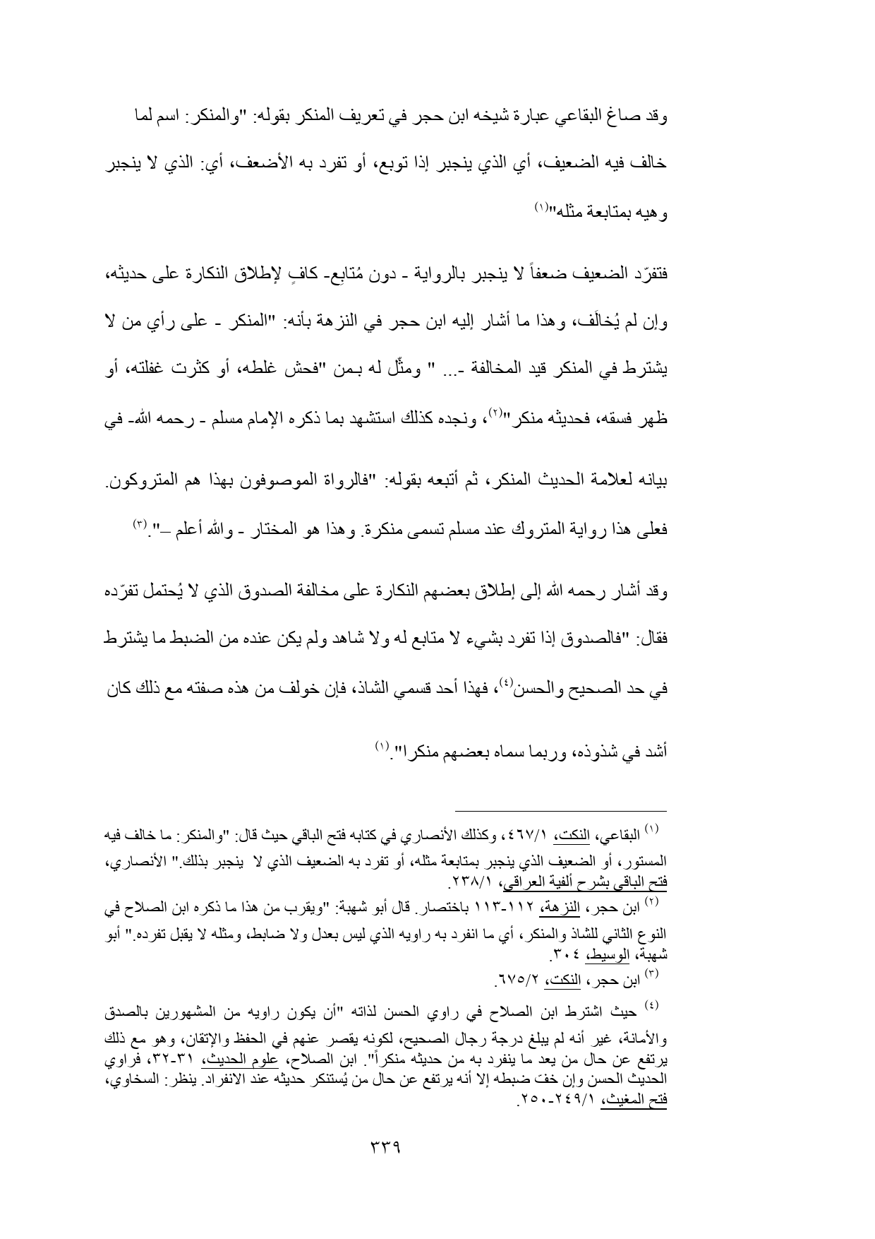 (¬2) ابن حجر، النزهة، 112 - 113 باختصار. قال أبو شهبة: "ويقرب من هذا ما ذكره ابن الصلاح في النوع الثاني للشاذ والمنكر, أي ما انفرد به راويه الذي ليس بعدل ولا ضابط, ومثله لا يقبل تفرده." أبو شهبة، الوسيط، 304.