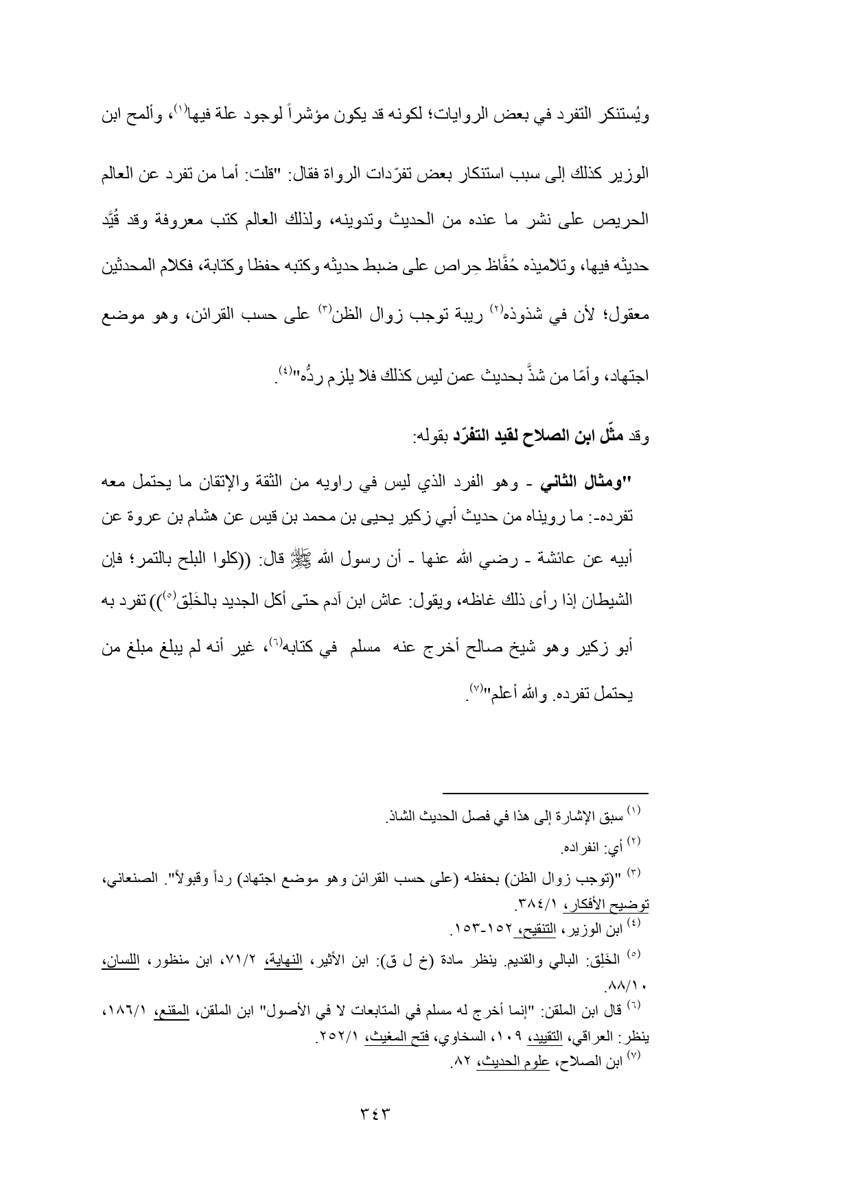 ويُستنكر التفرد في بعض الروايات؛ لكونه قد يكون مؤشراً لوجود علة فيها (¬1)، وألمح ابن الوزير كذلك إلى سبب استنكار بعض تفرّدات الرواة فقال: "قلت: أما من تفرد عن العالم الحريص على نشر ما عنده من الحديث وتدوينه، ولذلك العالم كتب معروفة وقد قُيَّد حديثه فيها، وتلاميذه حُفَّاظ حِراص على ضبط حديثه وكتبه حفظا وكتابة، فكلام المحدثين