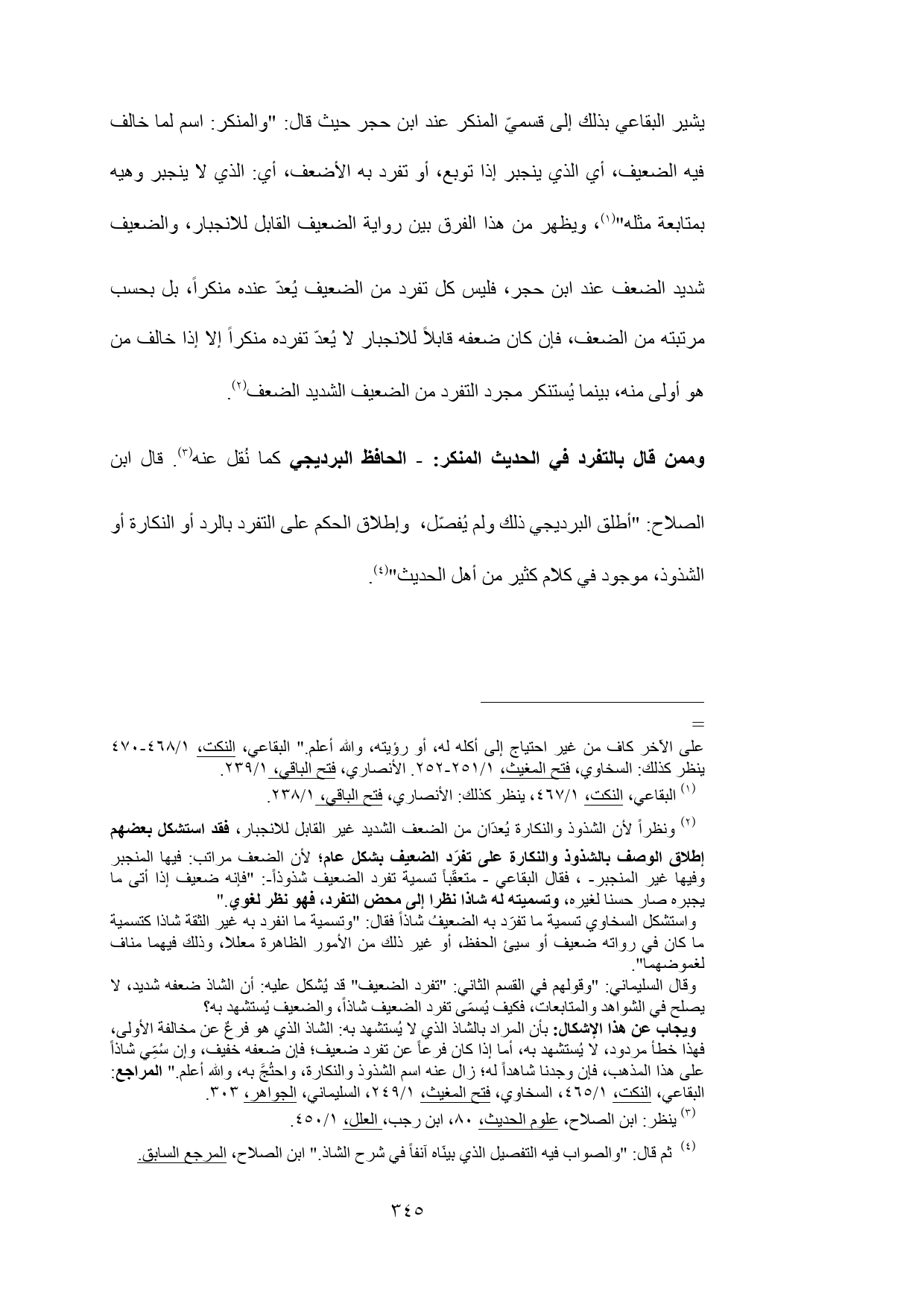 (¬2) ونظراً لأن الشذوذ والنكارة يُعدّان من الضعف الشديد غير القابل للانجبار، فقد استشكل بعضهم إطلاق الوصف بالشذوذ والنكارة على تفرّد الضعيف المراجع: البقاعي، النكت، 1/ 465، السخاوي، فتح المغيث، 1/ 249، السليماني، الجواهر، 303.